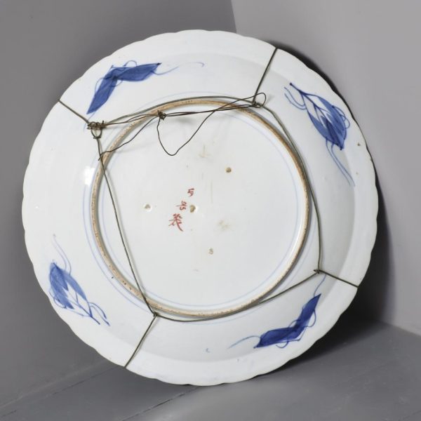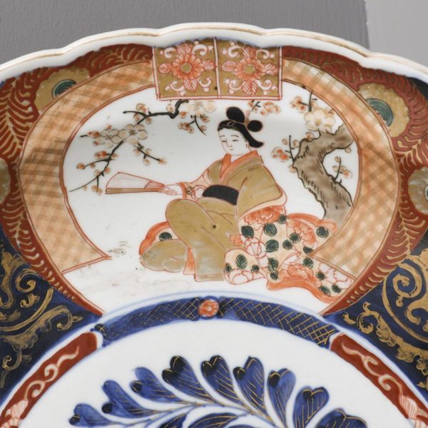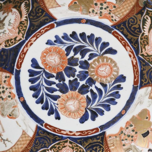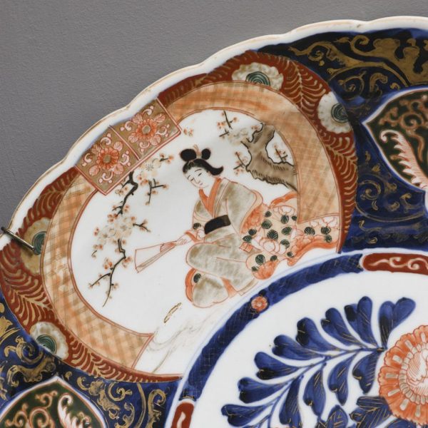 Circa 1860 (or earlier). Meji (or earlier) period Imari charger with fluted rim with gilding and typical Imari blue and red palettes. Centrally are a panel of chrysanthemums surrounded by panels with geisha girls or birds in rich colourings and gilding with minimal wear. The back with painted marks.
