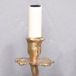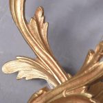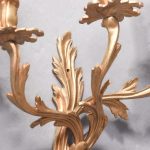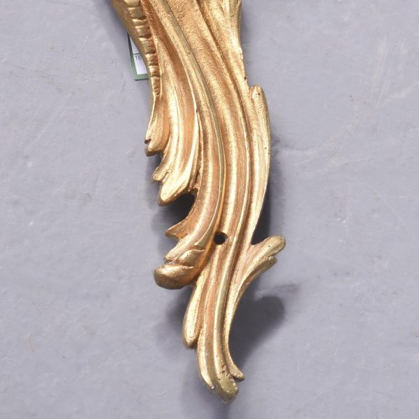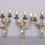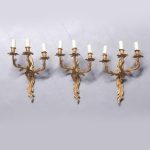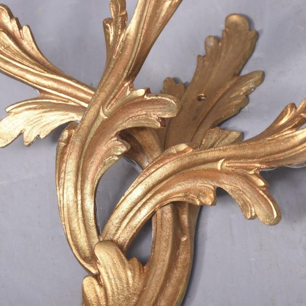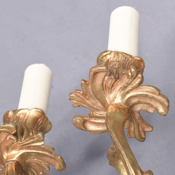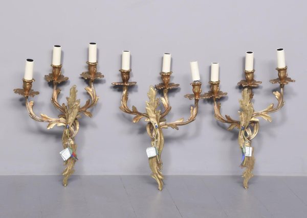 Circa 1920s. A set of three gilded brass three arm wall sconces (recently rewired). The Rococo shaped foliate upright, issuing three sinuous arms, each with a faux candle holder sitting on a cast brass flower head with a cast shaped petal beneath.