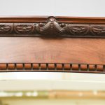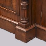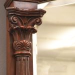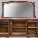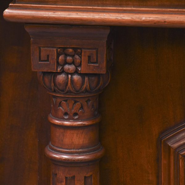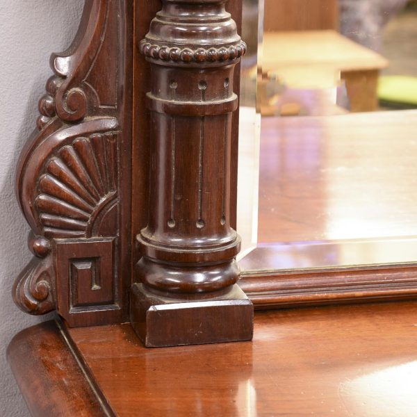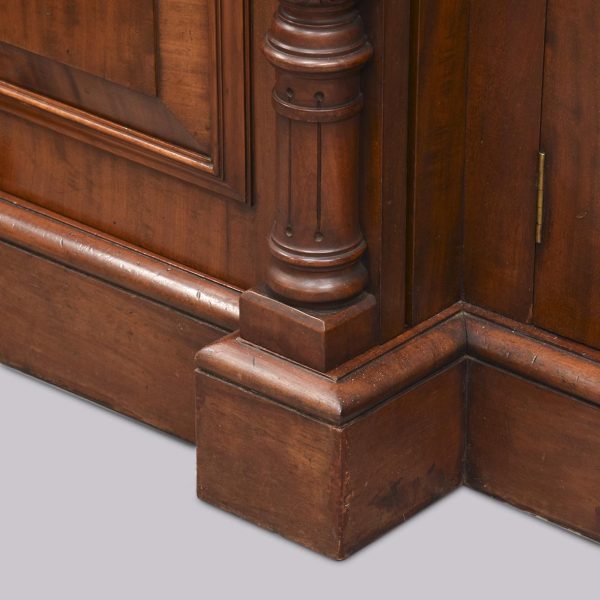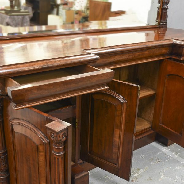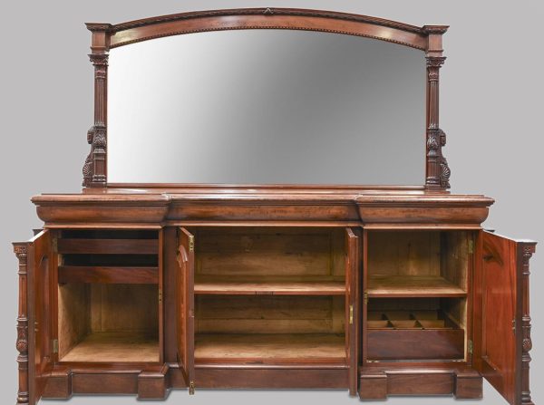 Circa 1870. Quality, large mirror-back Victorian mahogany chiffoniere (sideboard). The back with an arched beveled mirror, with plate in excellent condition, above a dentil key frieze and foliate carved moulding flanked by neo-classical pillars with Corinthian capitals and athenium decorations. The reverse breakfront base in a lovely figured Spanish mahogany above three shelved cupboards flanked by pilasters, all supported on an enclosed base.