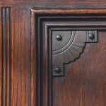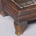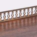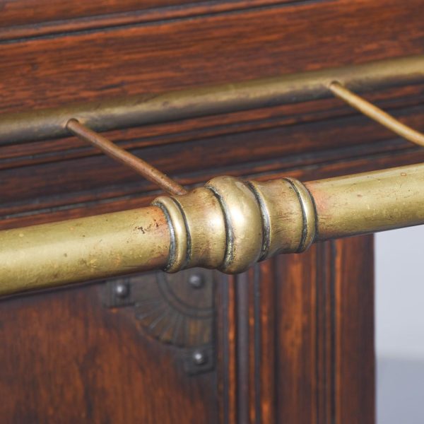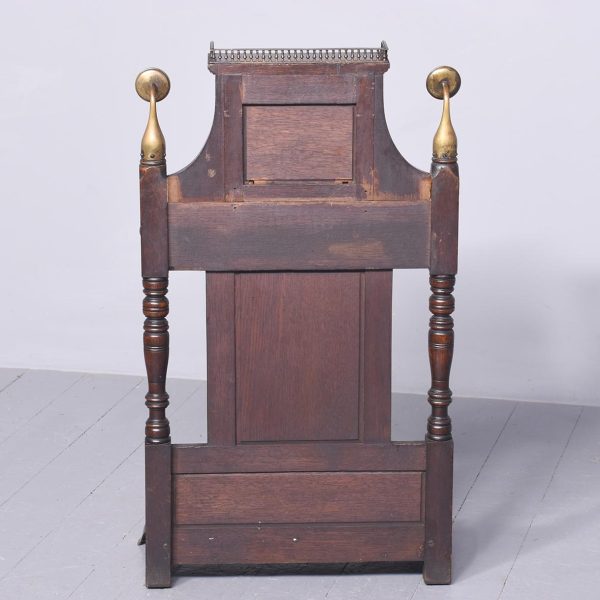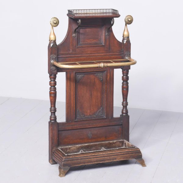 Circa 1870. A stylish and elegant oak and brass stick stand by ‘James Shoolbred & Sons, London’. (Established in the 1820s at 155 Tottenham Court Road) The raised center section with a pierced brass gallery with the top rail supported on elegant tiny balustrades, supported, and braced by a pair of curled metal brackets. To the sides is a pair of cast brass uprights finished with flower-heads, below the back with various panels, one with 4 brass spandrels and another with a Victorian maker’s kite mark, the curved cast brass stick holder has four divisions, with a removable drip tray in the base, resting at the front and a pair of splayed cast brass feet and simple uprights at the back.