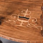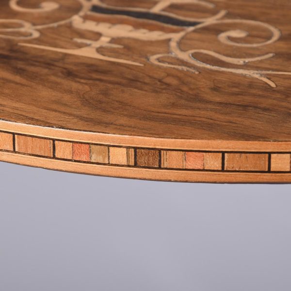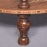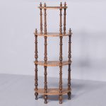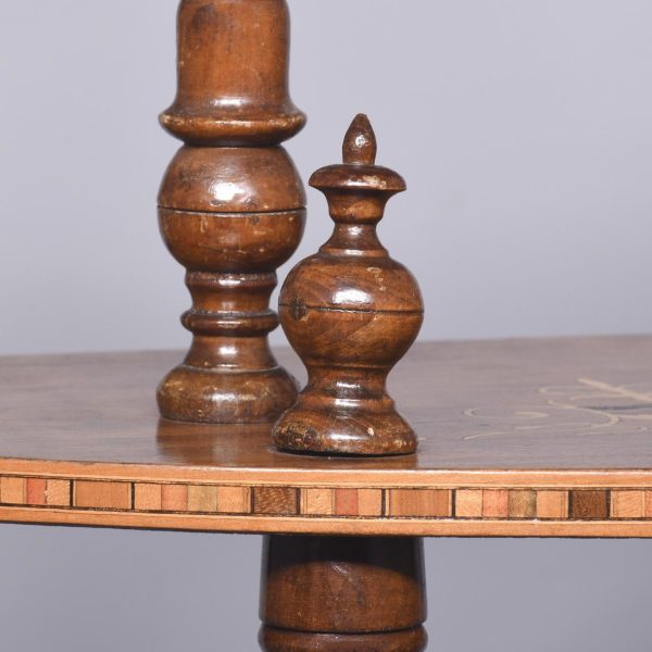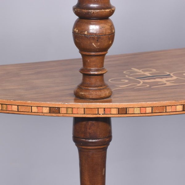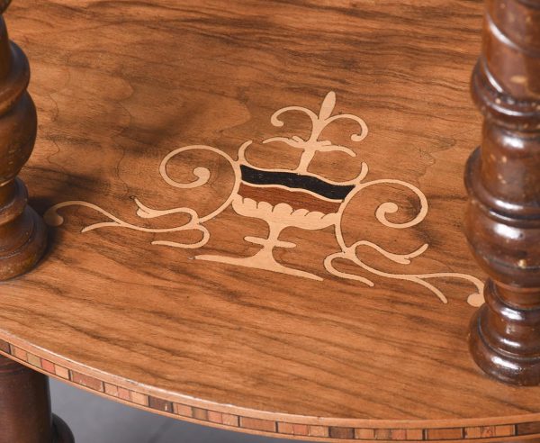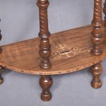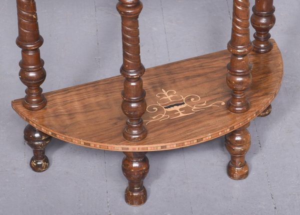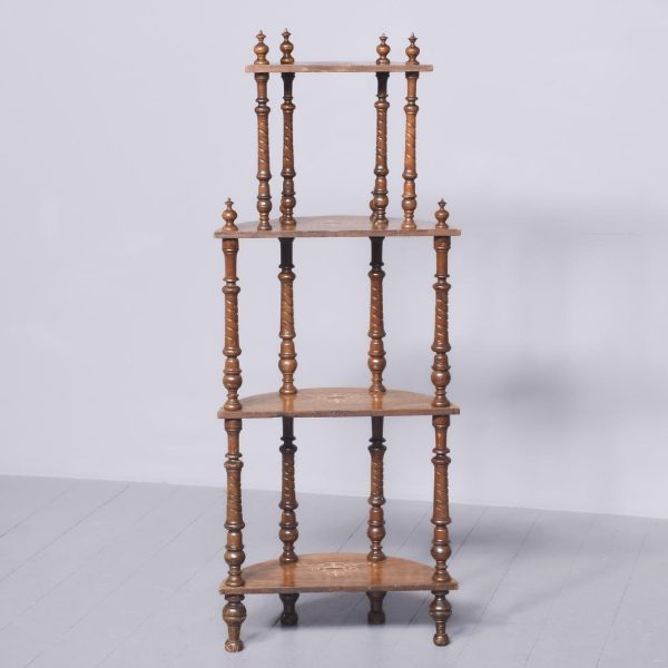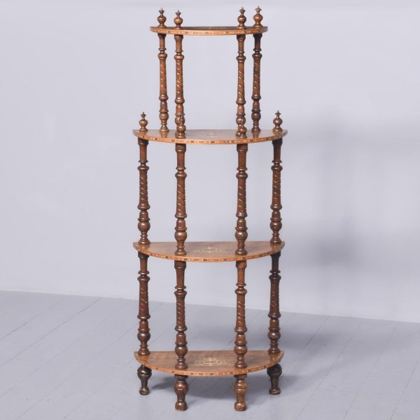 Circa 1880. A late Victorian burr walnut and inlaid 4 tier demi lune whatnot. The top tier with marquetry inlay and four elegant finials, the fore-edge with chequered Tunbridge style inlay, all of the tiers supported on four turned uprights with a spiral section in the centre with four finials, beneath the bottom tier the whatnot rests on four bulbous feet.