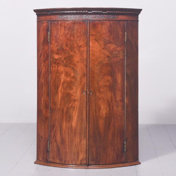 Circa 1770 George III bow-front figured mahogany hanging corner cupboard of exceptional quality. Surmounted by a moulded and dentil cornice above a beaded frieze with blind fret decoration. The twin bow front doors open to a shelved interior, above a neat, moulded base. In excellent condition with a rich colour and patina of the figured mahogany.