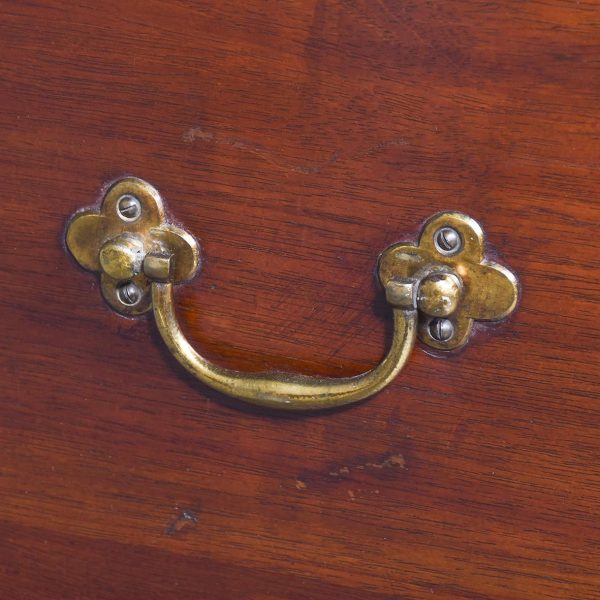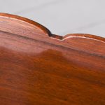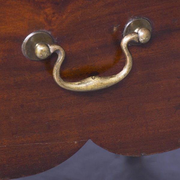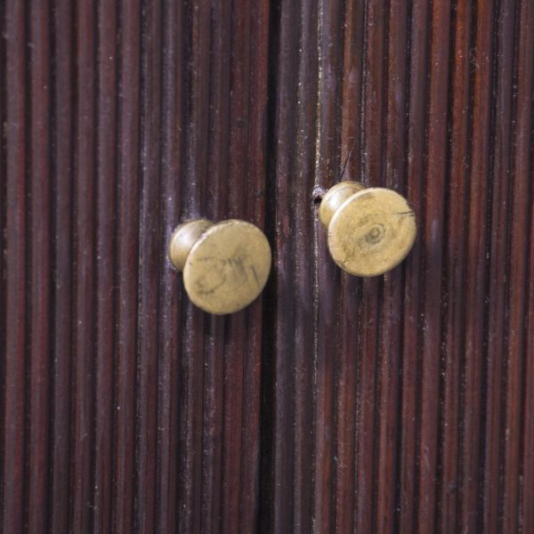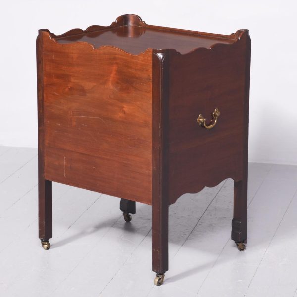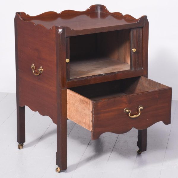 Circa 1780. A George III mahogany tambour fronted bedside commode of generous proportions, the solid top with its wavy wrap around gallery which dips low at the front, the pair of tambour doors beneath open to reveal an uninterrupted interior, beneath a drawer with cast brass swan neck handle and shaped frieze, the bedside rests on 4 square legs the front ones with reeding on the facings, cast brass lifting handles to the side all resting on brass castors.