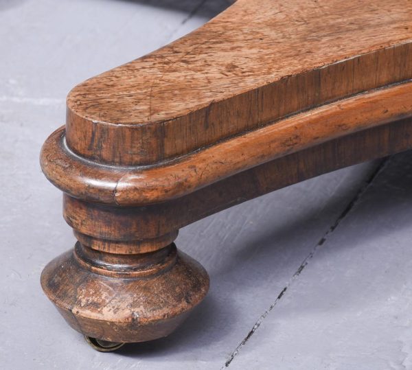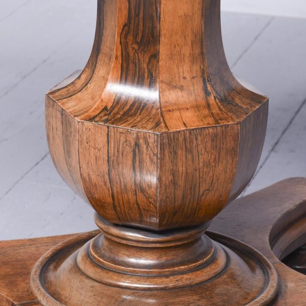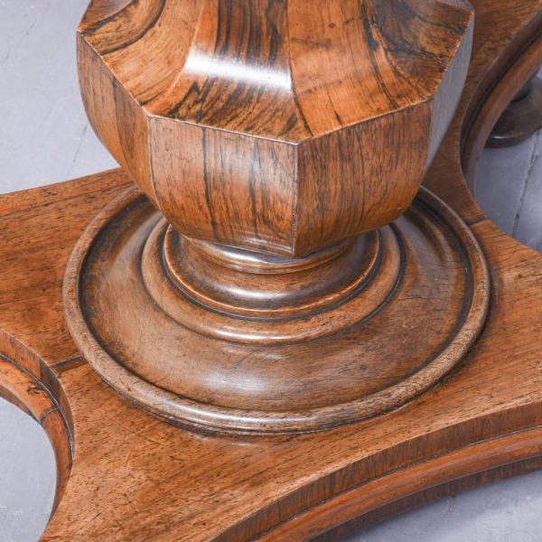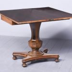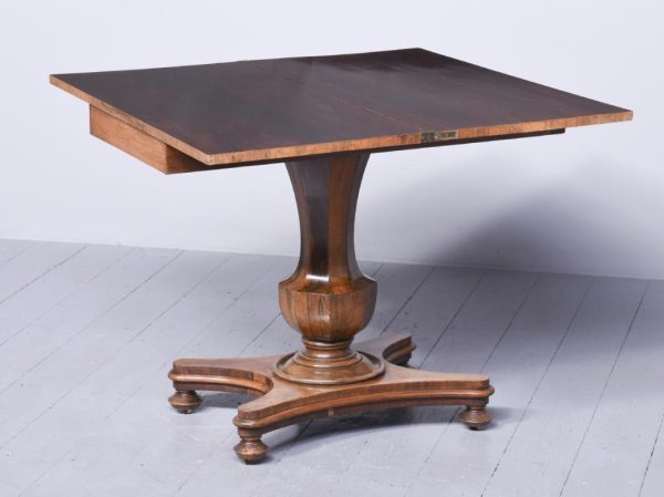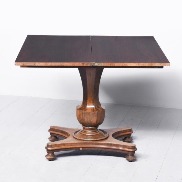 Circa 1830. A good George IV rosewood fold over tea table. The top in well figured rosewood, is hinged to reveal a rich rosewood interior, with a small compartment beneath the top. The table has a simple frieze, all resting on a shaped canted urn shaped stem, sitting on a concave platform base with beading to the fore edge. Resting on squat bub feet with concealed castors beneath.