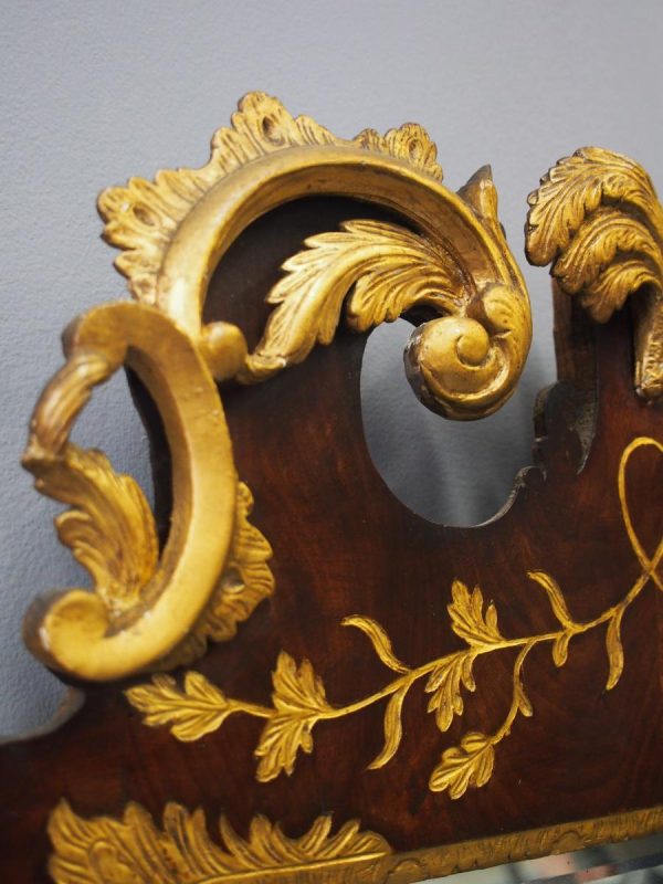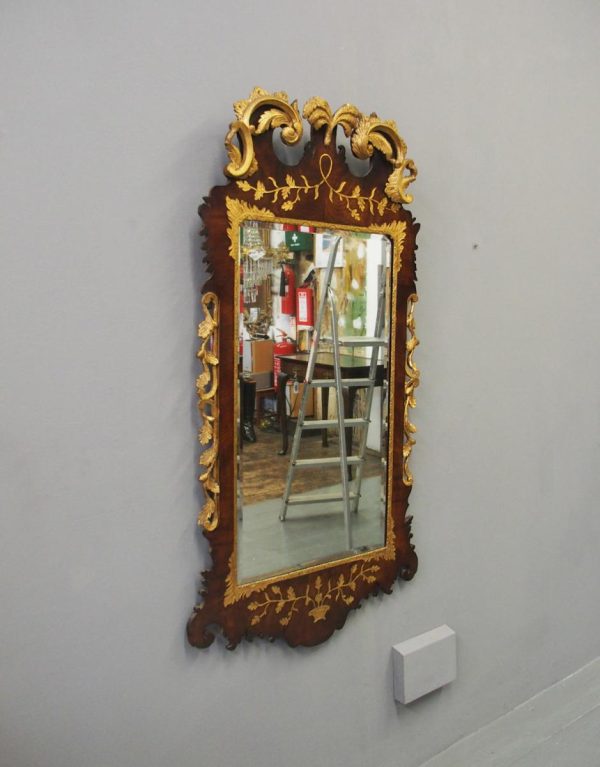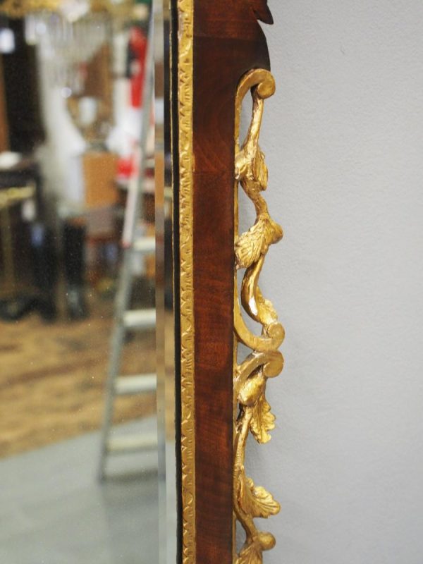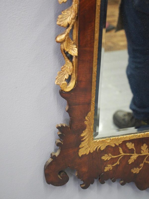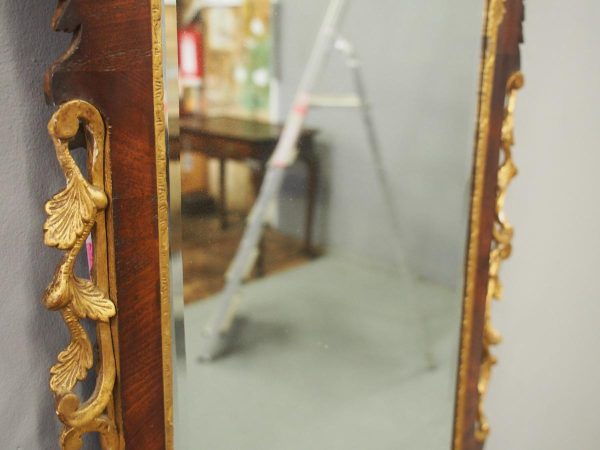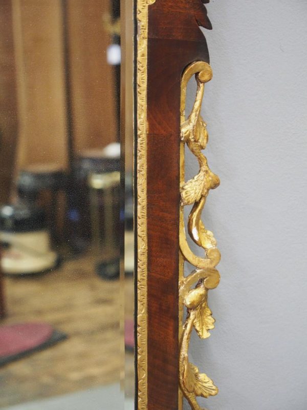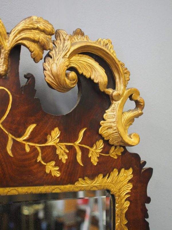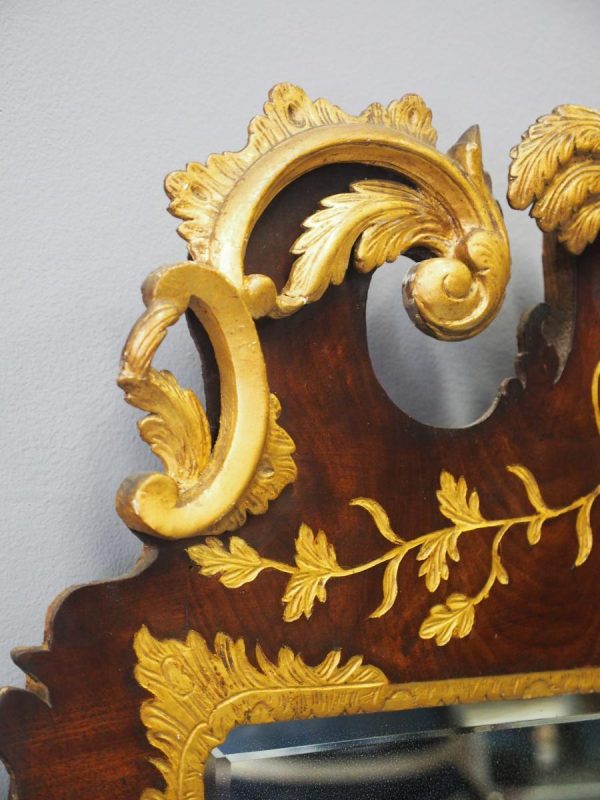 Circa 1800, Georgian Chippendale style mahogany and giltwood wall mirror. With a classical Chippendale shaped pediment with engraved and gilded foliate decorations surmounted by applied giltwood rococo scrolls and feathers. The original rectangular bevelled mirror plate is in good condition surrounded by a gilded slip. The sides have open giltwood trailing foliage and the shaped base have matching engraved and gilded foliate decoration.