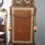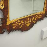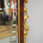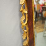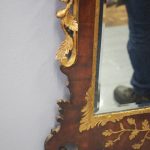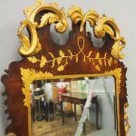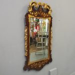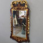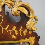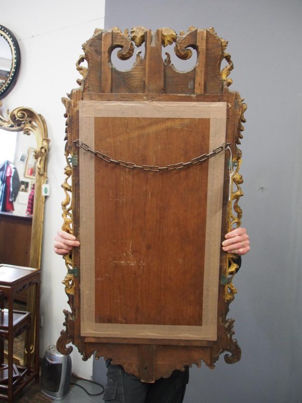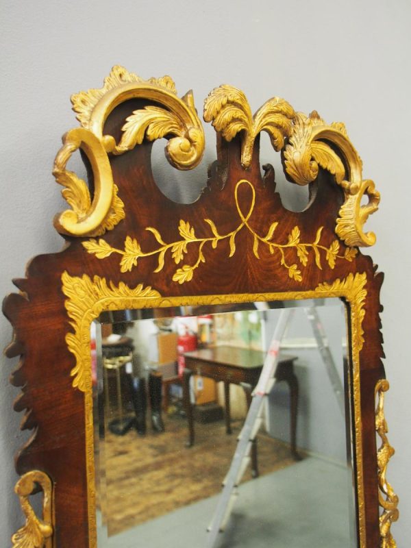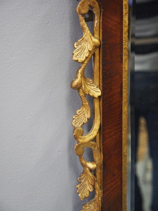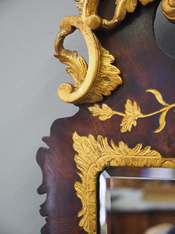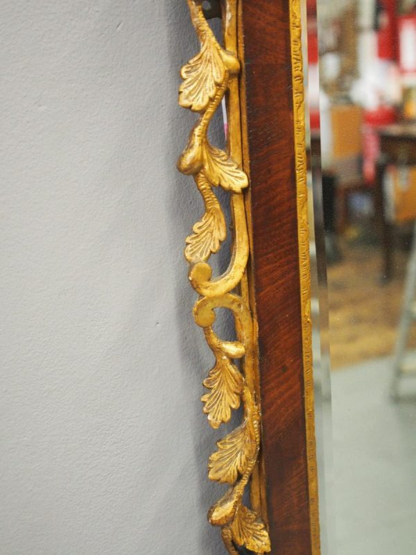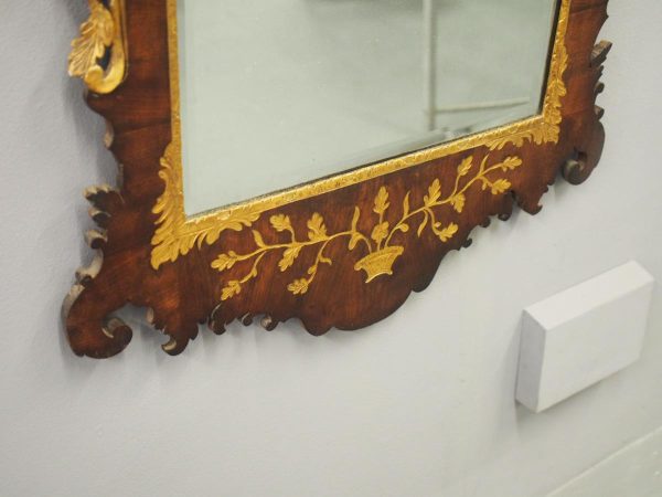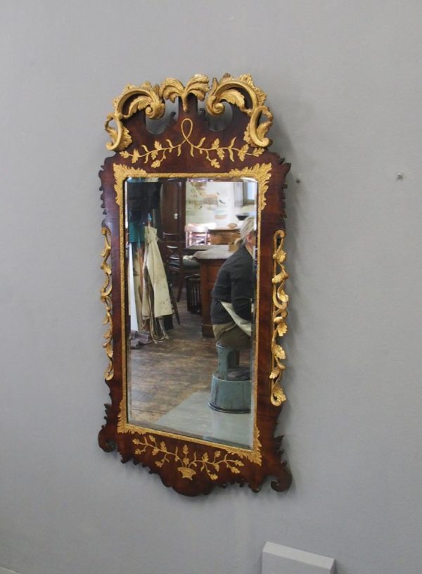 Circa 1800, Georgian Chippendale style mahogany and giltwood wall mirror. With a classical Chippendale shaped pediment with engraved and gilded foliate decorations surmounted by applied giltwood rococo scrolls and feathers. The original rectangular bevelled mirror plate is in good condition surrounded by a gilded slip. The sides have open giltwood trailing foliage and the shaped base have matching engraved and gilded foliate decoration.