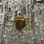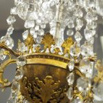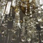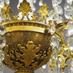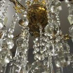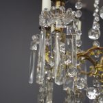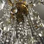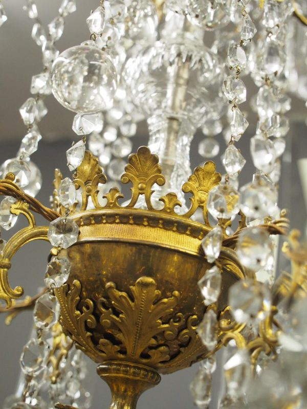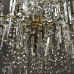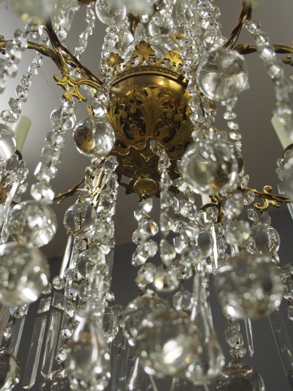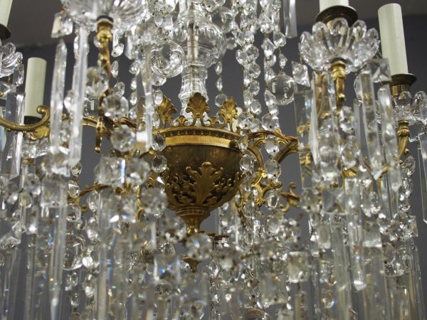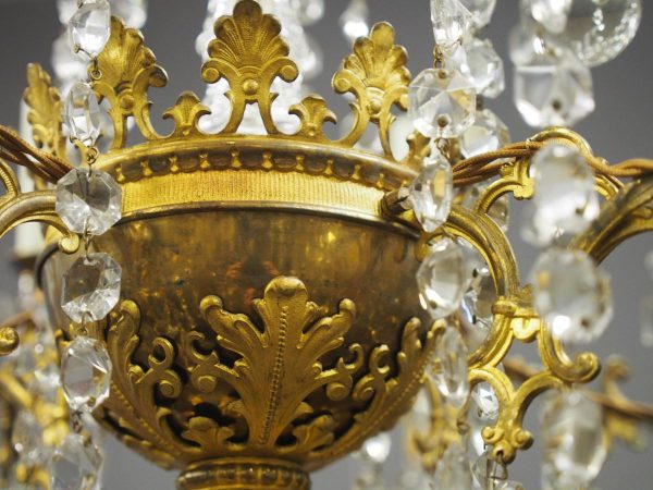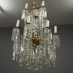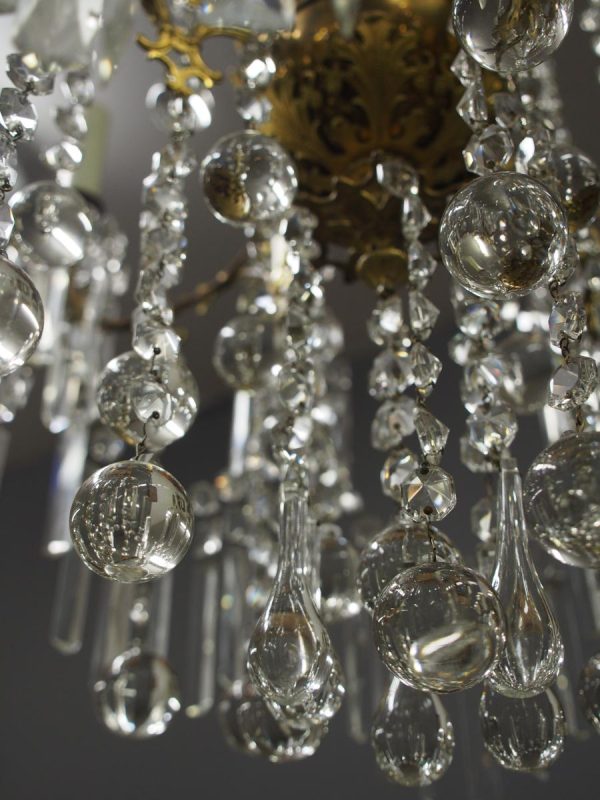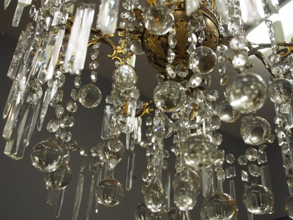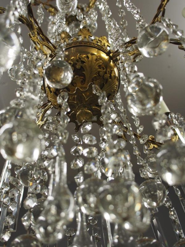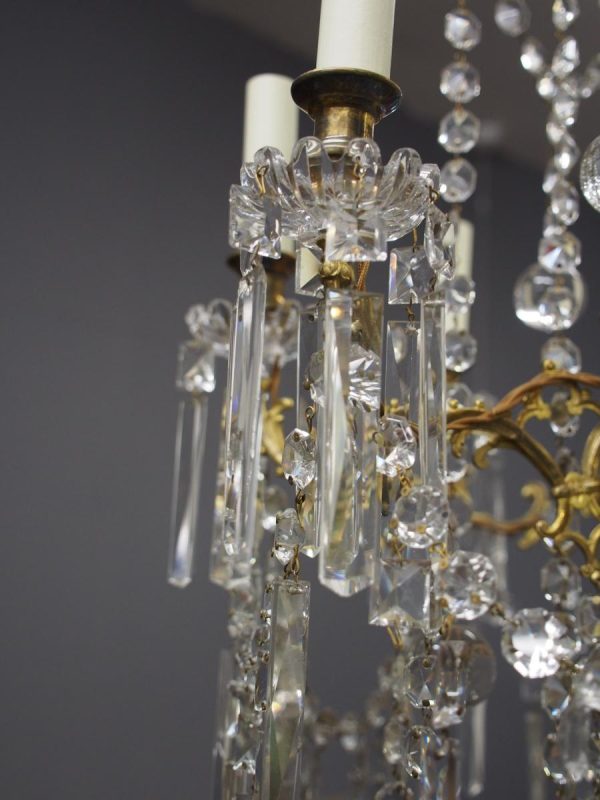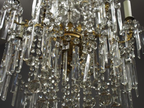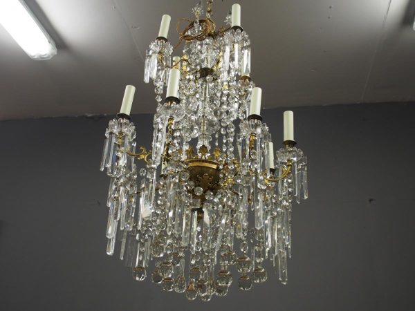 Circa 1900, an unusual glass and gilded brass 2 tier chandelier. With 4 small glass finials held in place by a mixture of glass column and gilded brass supports, with gilded arms extending out to 4 lamp holders (top tier) and 8 lamp holders (lower tier). It has glass beading across the chandelier, with a mixture of faceted glass, glass balls and pear shaped droplets, and it has been recently rewired, and comes with a chain and ceiling rose.