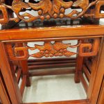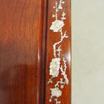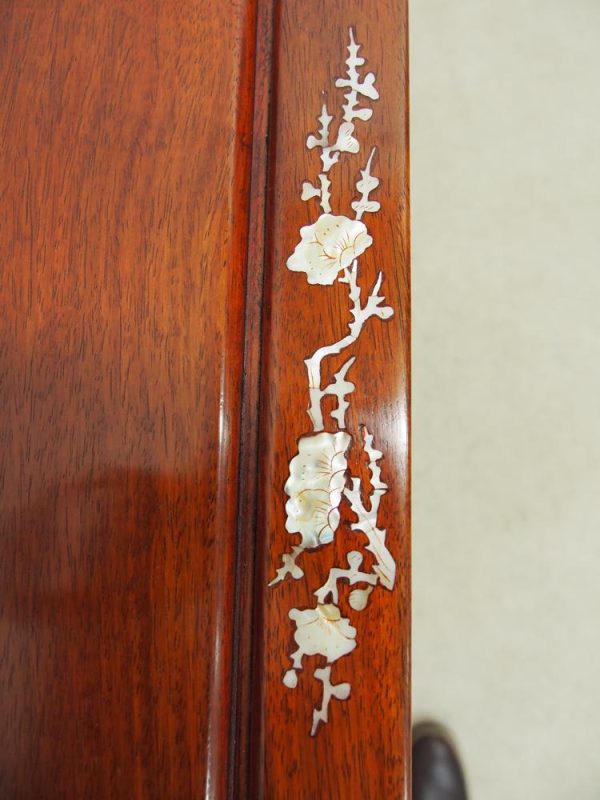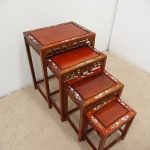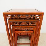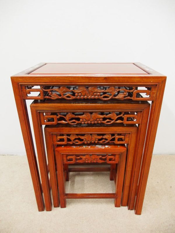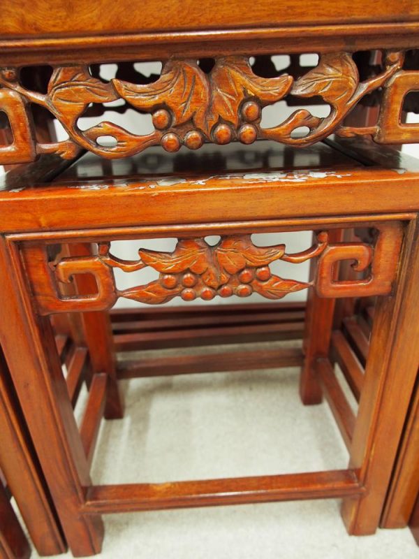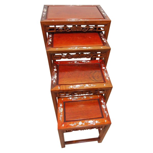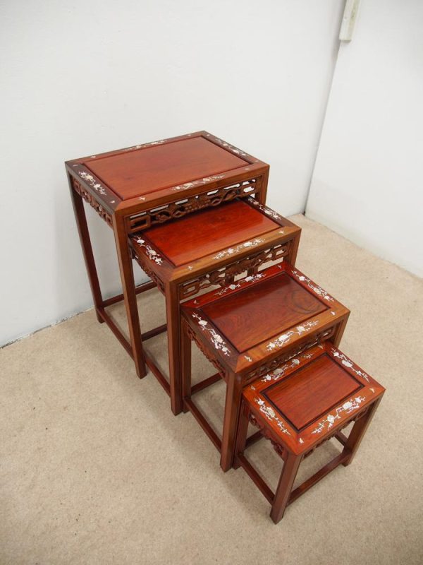 Circa 1900, Chinese quartet of carved hongmu tables with mother of pearl floral inlay. The beautiful mother of pearl inlay is on the top of the table and composes a pattern of flowers, butterflies and birds. The tables each have an open carved fretwork frieze, consisting of vine decorations. Each table stands on fluted, tapering supports with cross-stretchers.