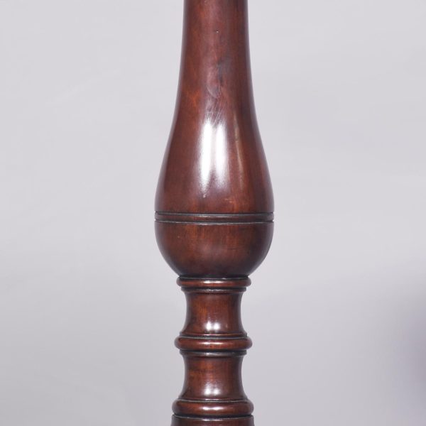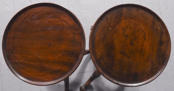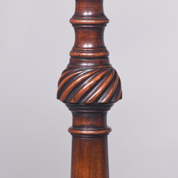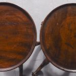 Circa 1870 the pair with circular dished tops on baluster columns with spiral carved knops, supported on a tripod base on acanthus carved cabriole legs ending in scrolled toes.
