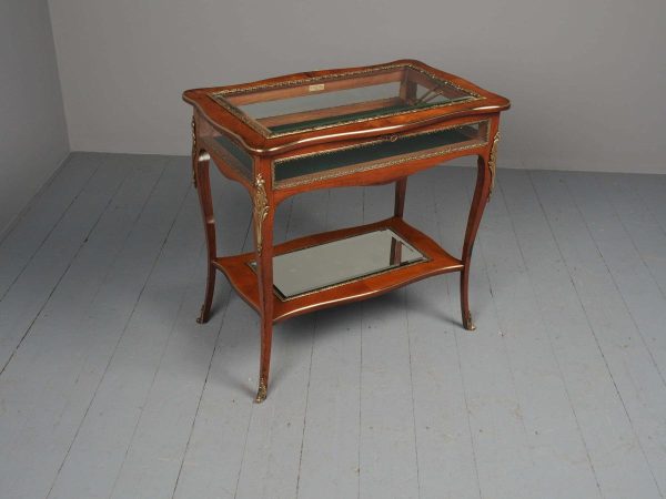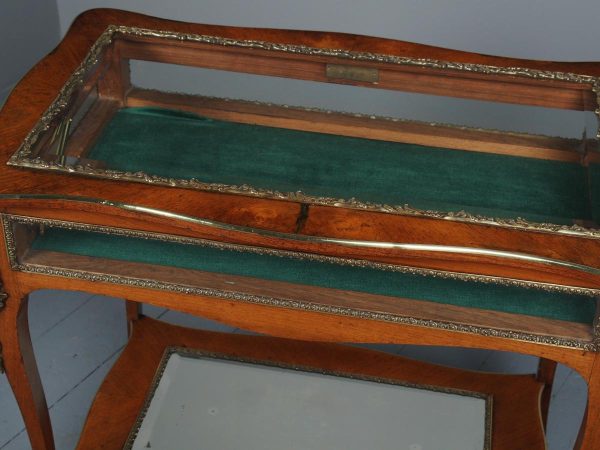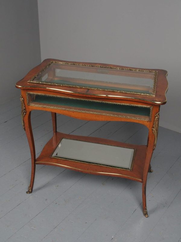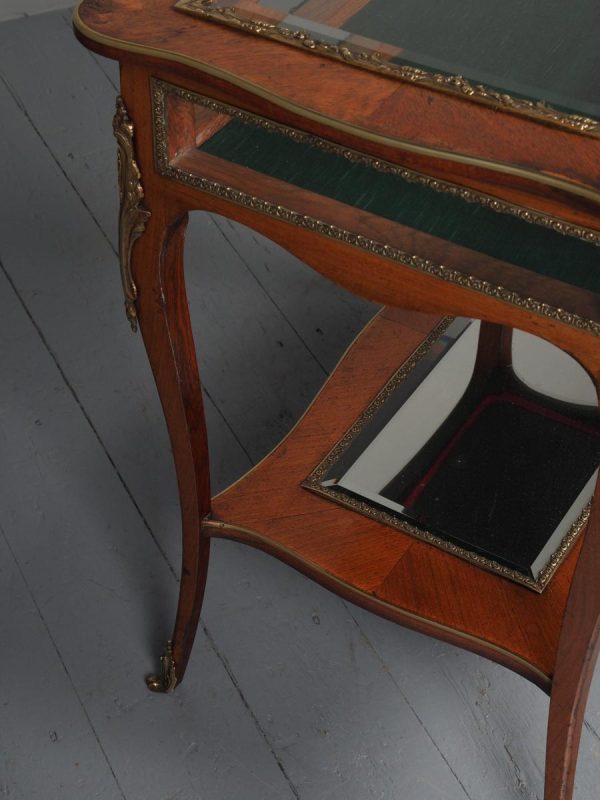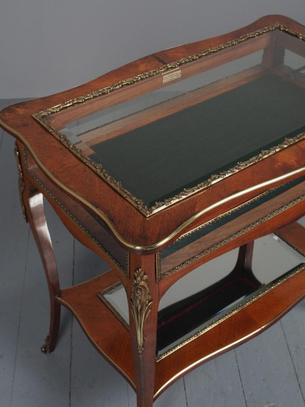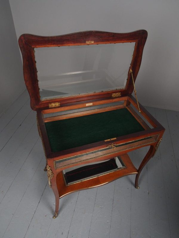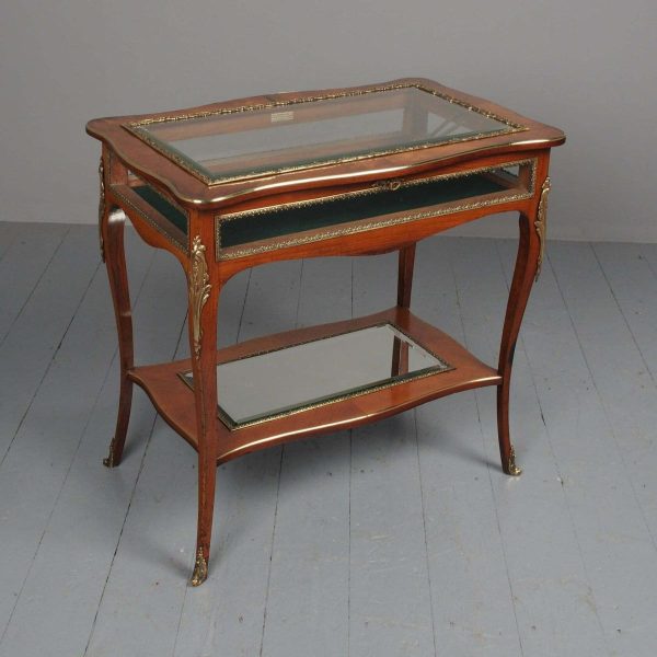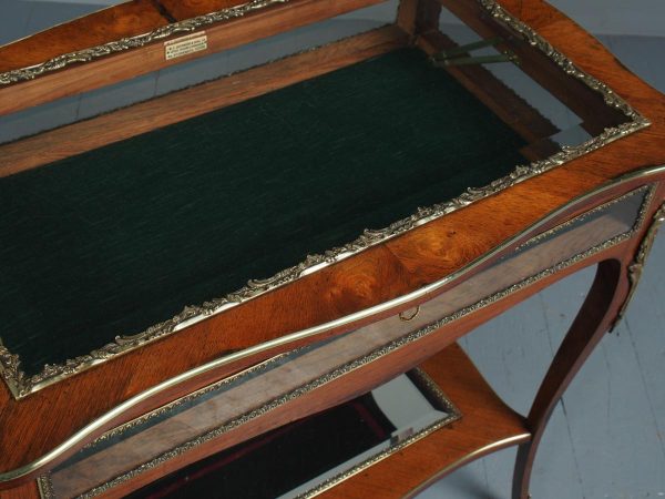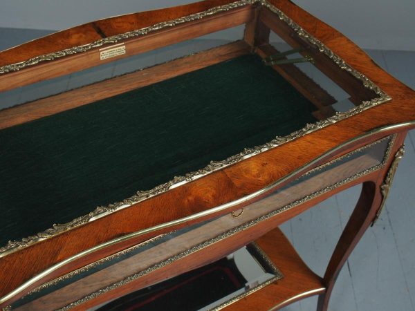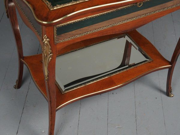 Circa 1880, kingwood and gilt metal mounted bijouterie table, bearing the plaque of cabinetmakers and retailers W. F. Greenwood & Sons Ltd., 24 Stonegate, York. The hinged, serpentine top with bevelled edge glass enclosing a velvet lined interior, over a similar shaped under tier with framed, bevelled edge mirror. On cabriole legs with fine rococo style cast knees and elegant cast brass sabots.