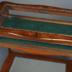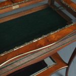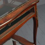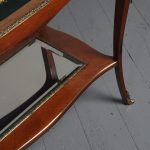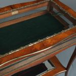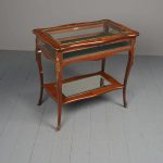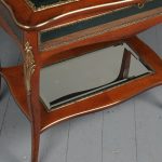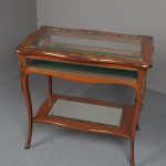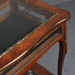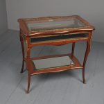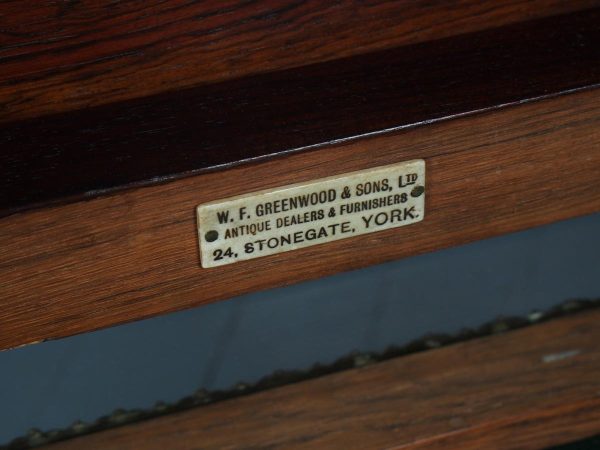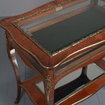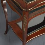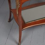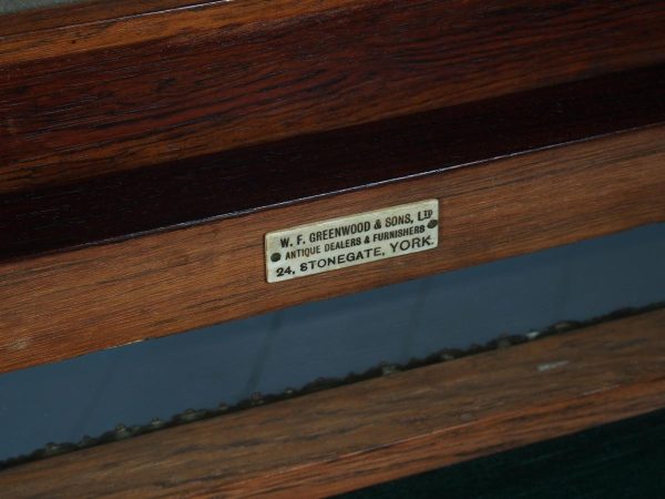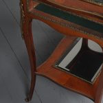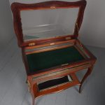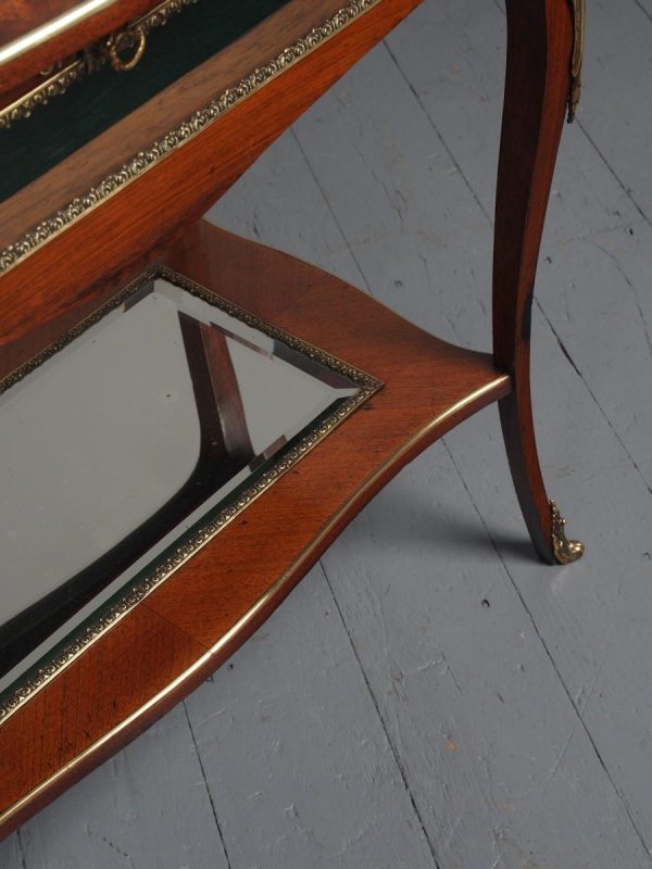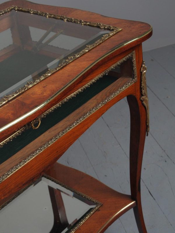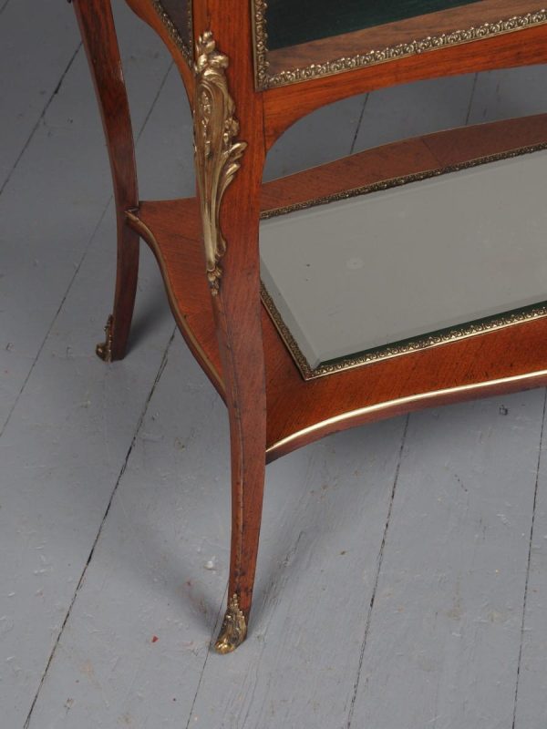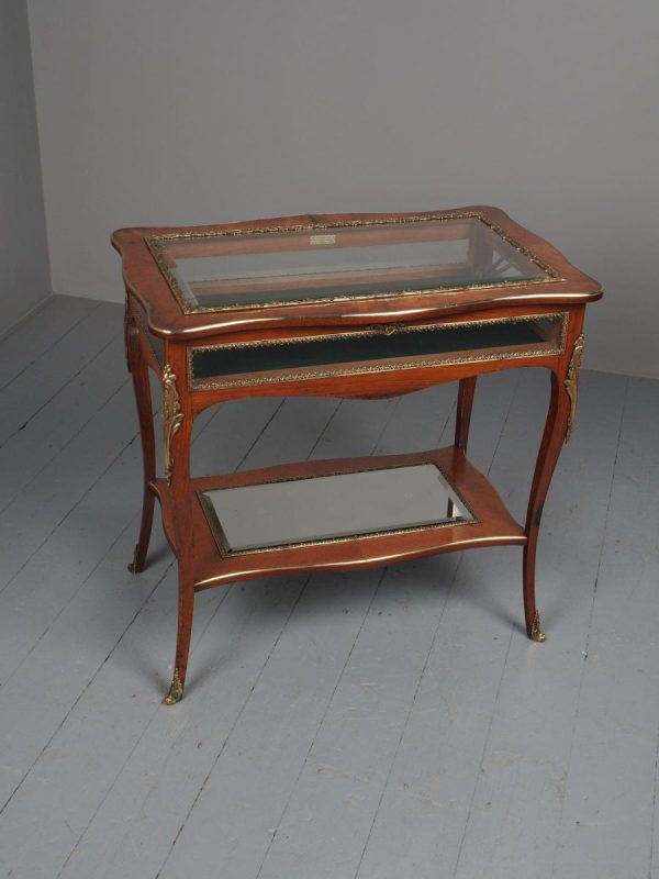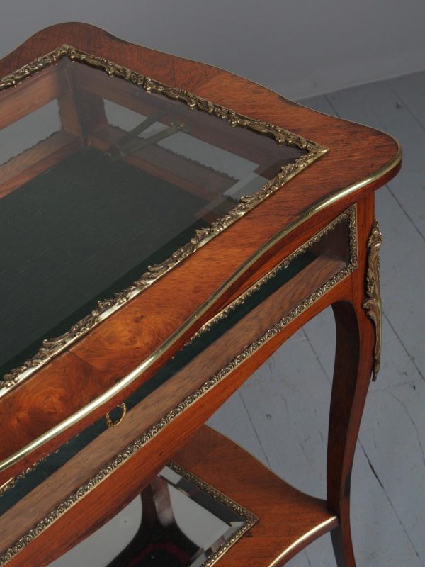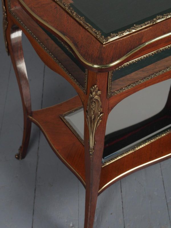 Circa 1880, kingwood and gilt metal mounted bijouterie table, bearing the plaque of cabinetmakers and retailers W. F. Greenwood & Sons Ltd., 24 Stonegate, York. The hinged, serpentine top with bevelled edge glass enclosing a velvet lined interior, over a similar shaped under tier with framed, bevelled edge mirror. On cabriole legs with fine rococo style cast knees and elegant cast brass sabots.