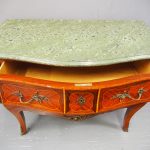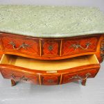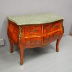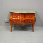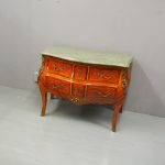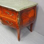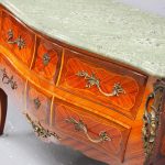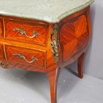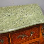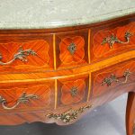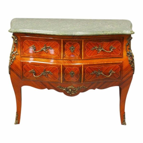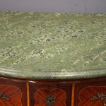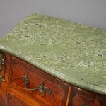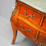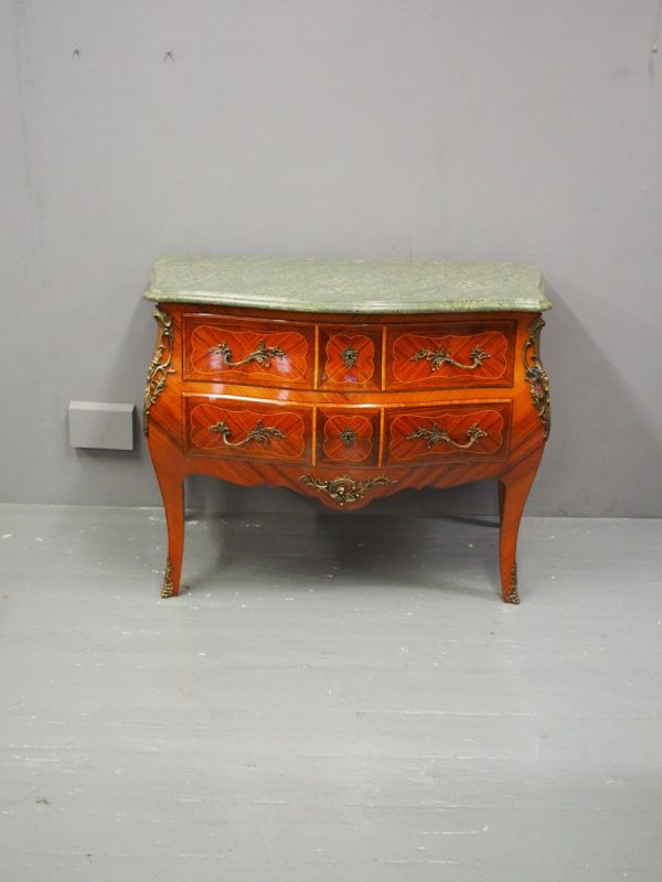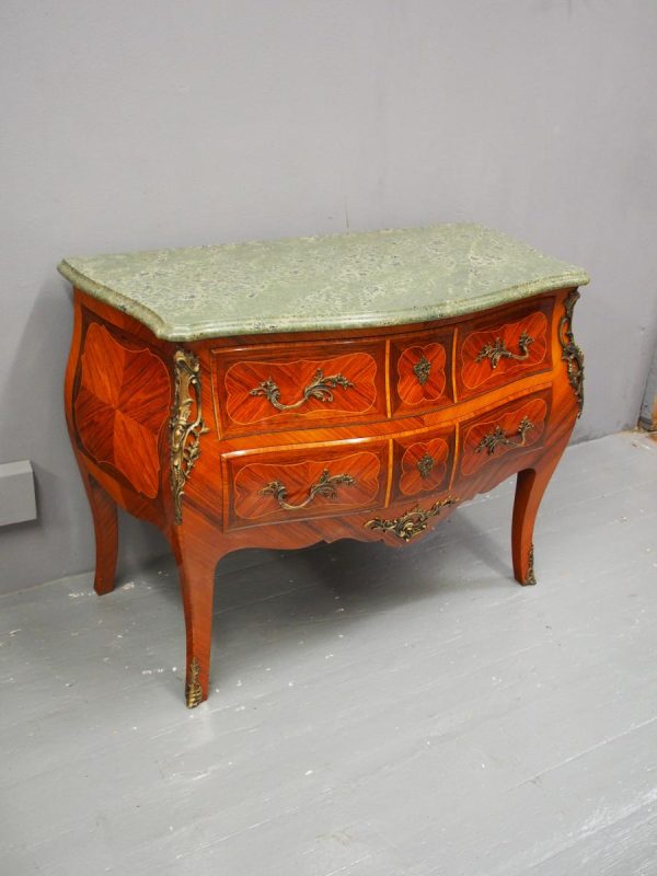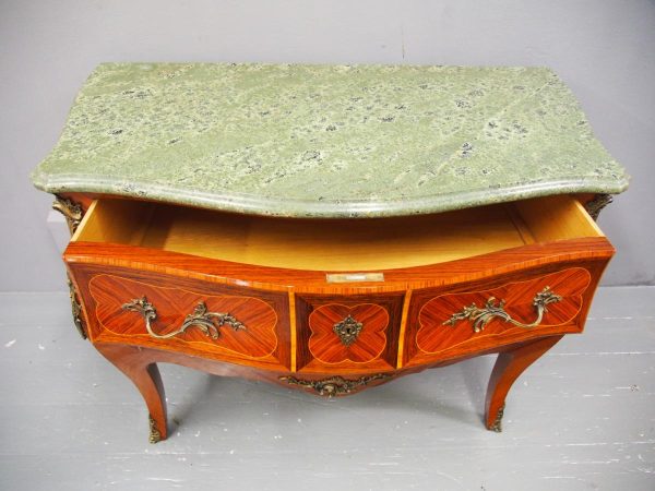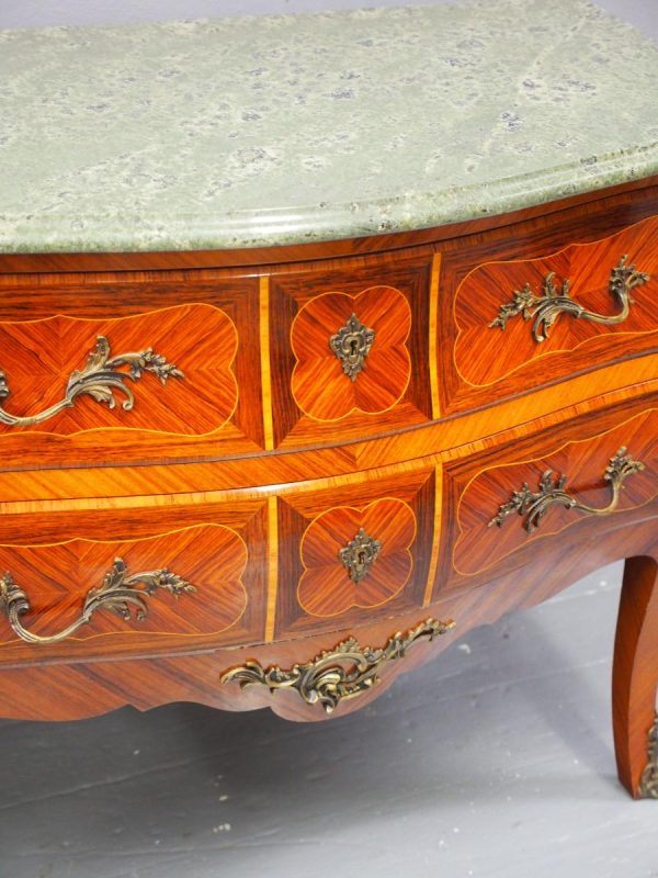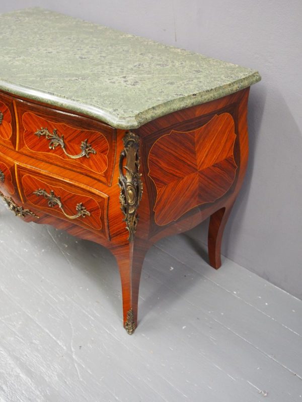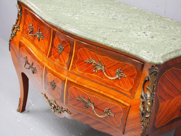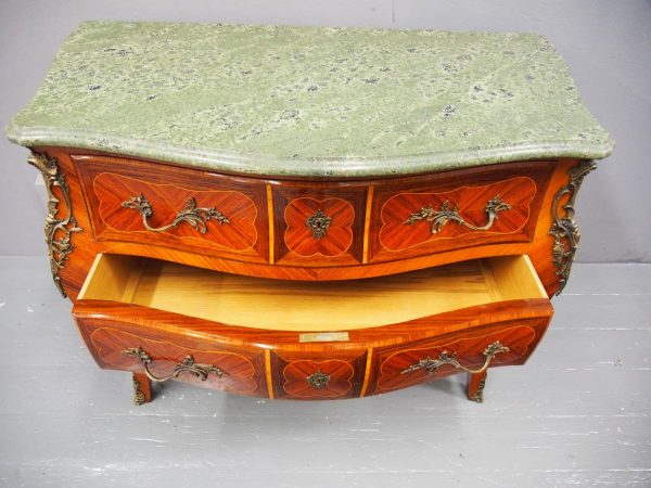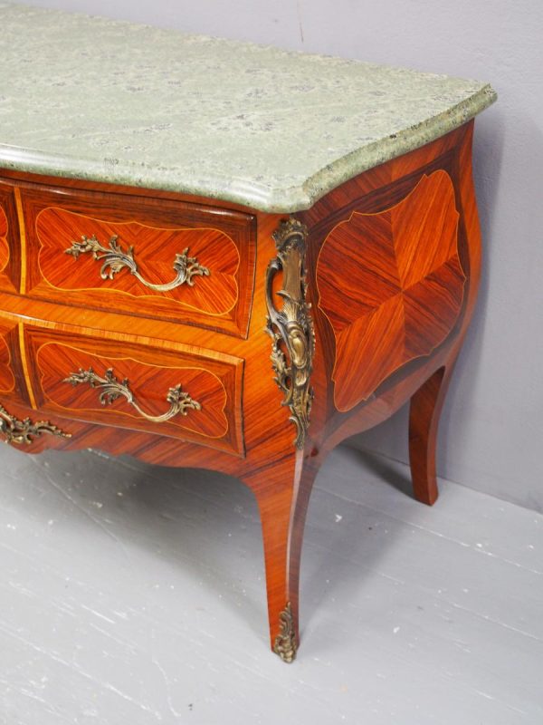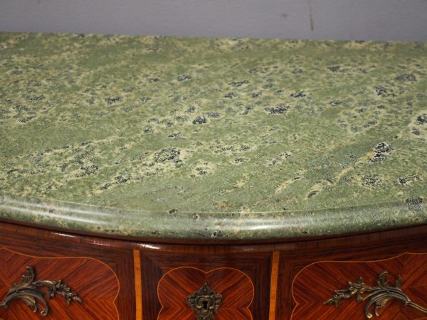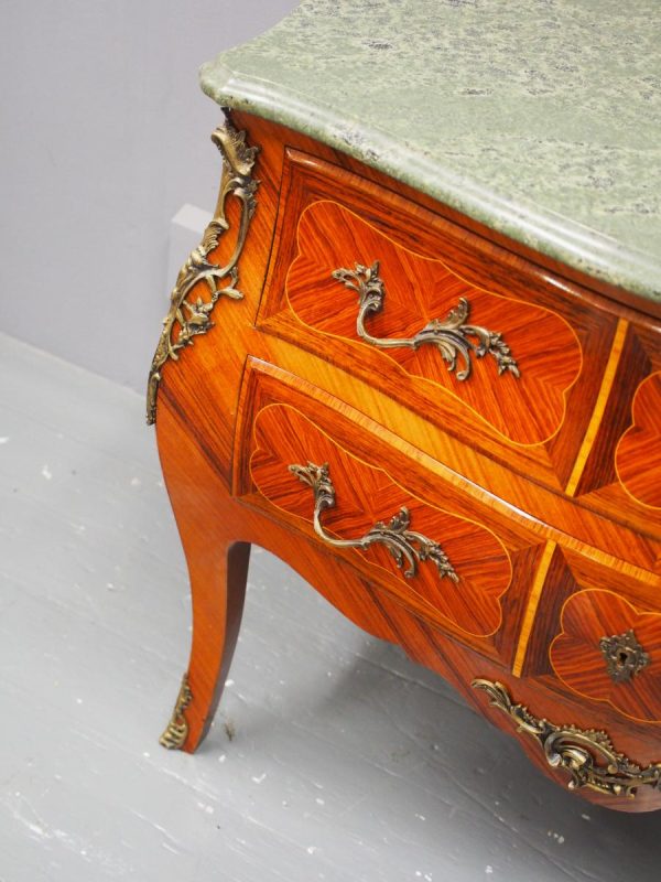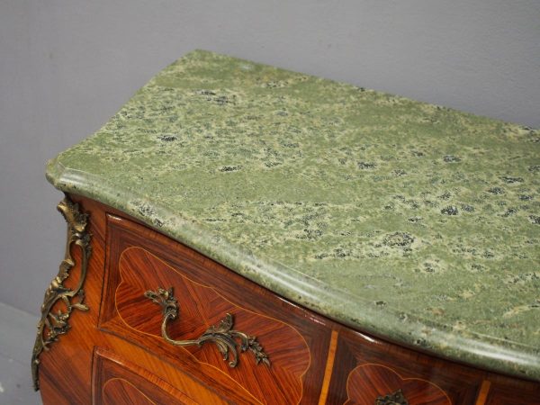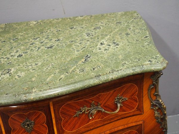 Mid 1900s, Swedish kingwood, serpentine-front marble top commode. The green flecked marble top with a moulded fore-edge is over 2 long, bombe-front drawers with solid oak liners, quartered kingwood panels, satinwood and boxwood inlay and rococo brass handles and escutcheons. The cabriole supports have cast brass rococo mounts and sabots.