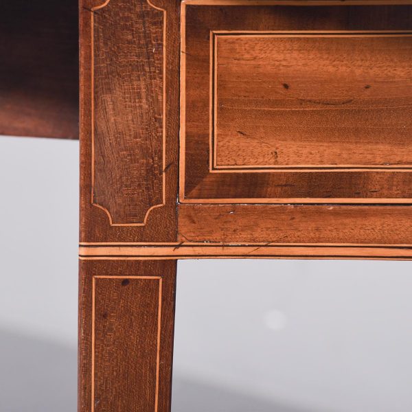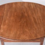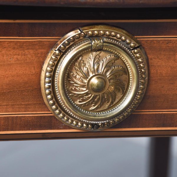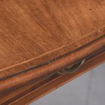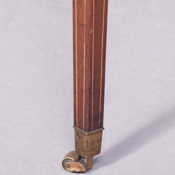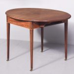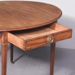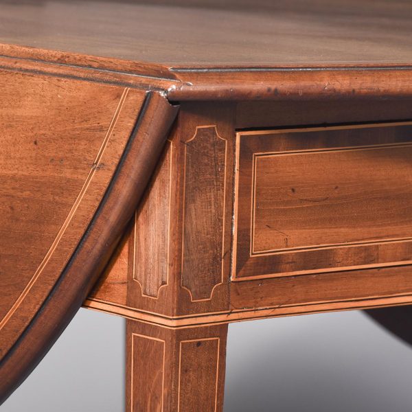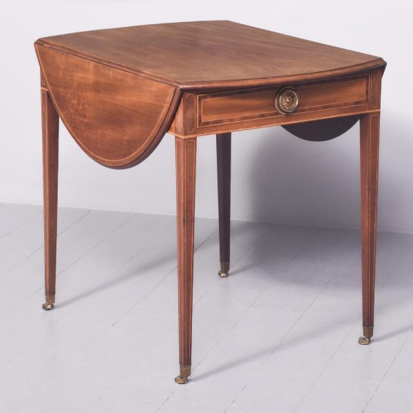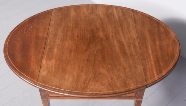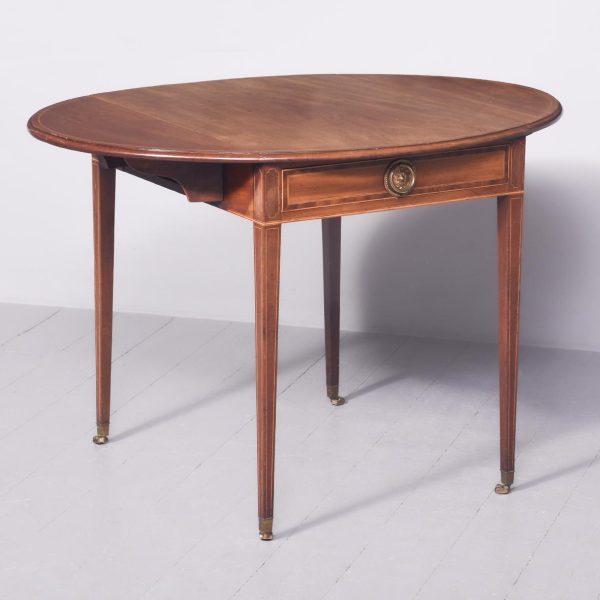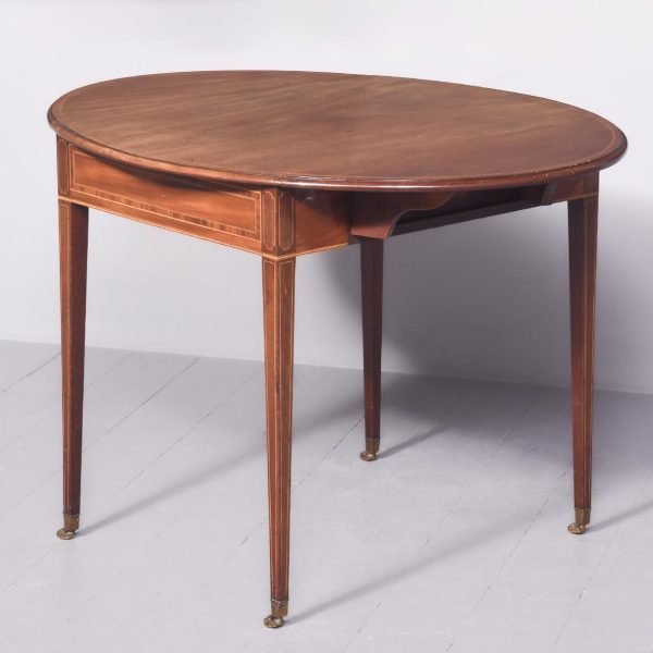 Circa 1790. Quality inlaid mahogany George III Pembroke table in totally original perfect condition. The top, oval when open, with multiple inlays around the periphery and moulded edges with a lovely colour and patina of its figured Spanish mahogany above a frieze drawer with crossbanding, boxwood, ebony and string inlay and original circular brass handles. With partridge wood insets to the top of the square, inlaid tapering legs above original brass caps and castors.