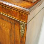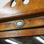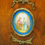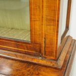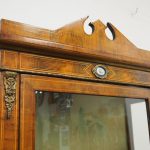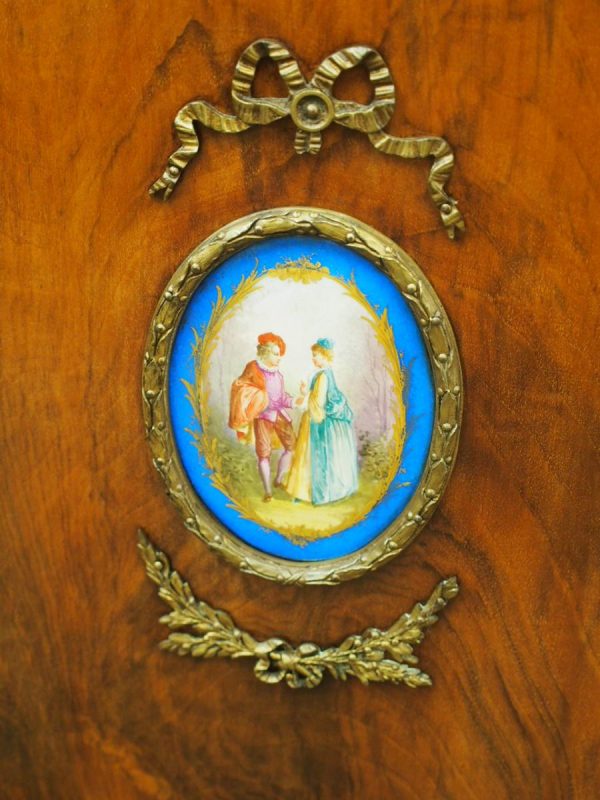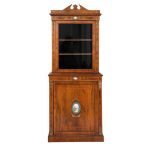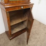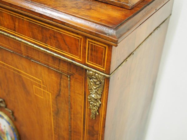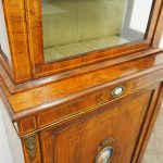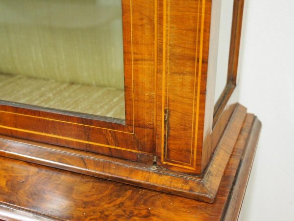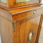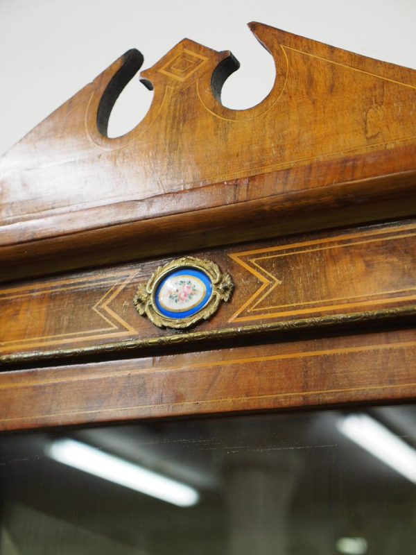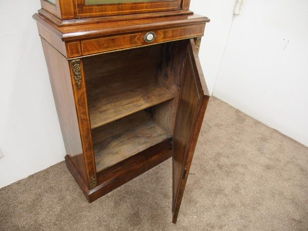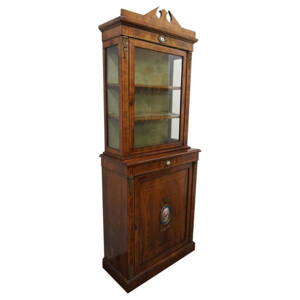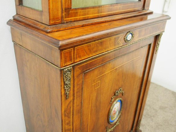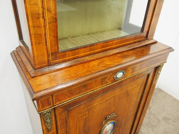 Circa 1870, tall Victorian display case in inlaid figured walnut. The upper, silk-lined glazed section is surmounted by an inlaid shaped pediment. It has an inlaid frieze with a Sevres type plaque, and with ormolu mounted pilasters at sides. The base has a similarly decorated frieze and pilasters with a figured walnut door, and a central, large ormolu mounted Sevres- type plaque. It is all standing on an enclosed plinth base.