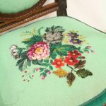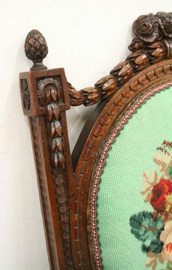 Circa 1890, unusual highly decorative carved walnut Louis XVI style armchair. The chair has foliate and floral carving and wonderful finials. The oval panel on the back, the seat pad and arm pads are upholstered in fine needle point. The chair is serpentine fronted, has shaped sides and stands on 4 elegant turned, fluted and tapering legs. Good example of cabinet making and needlepoint.
