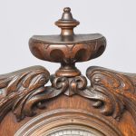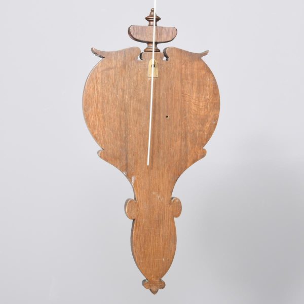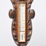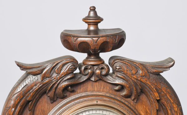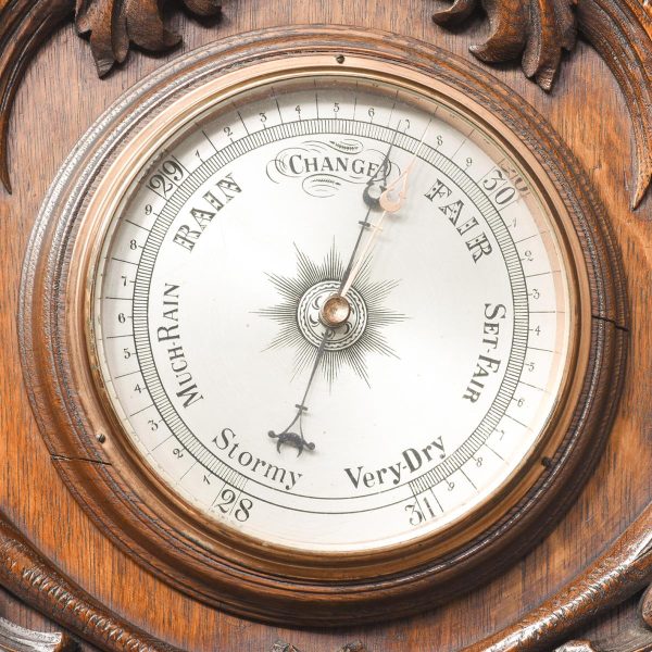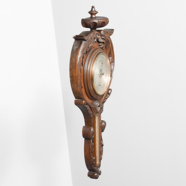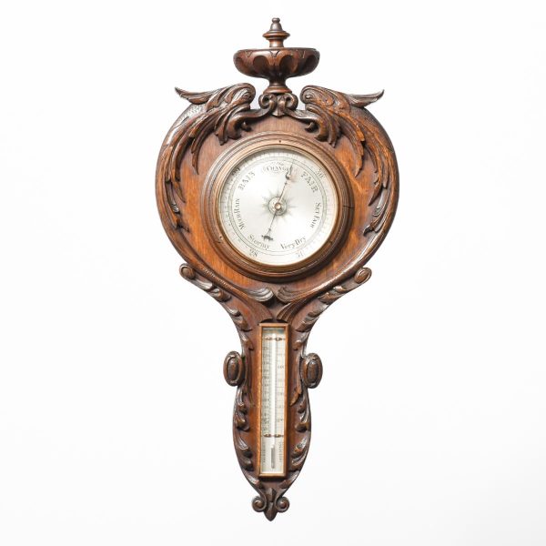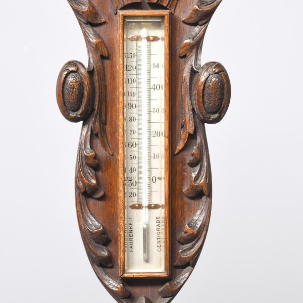Circa 1900. An unusual carved oak barometer thermometer. The solid oak frame in the form of a carved cartouche surmounted by a massive finial, barometer in the center, silver face with copper moving arm, bevel edge glass held in place by a copper bezel. Towards the base an enclosed thermometer.