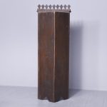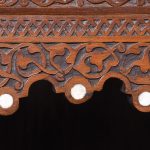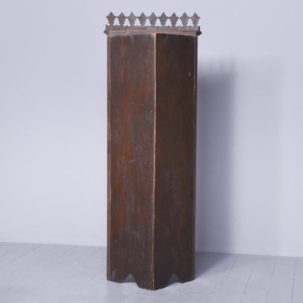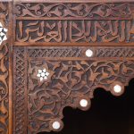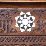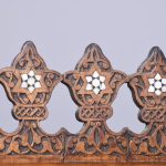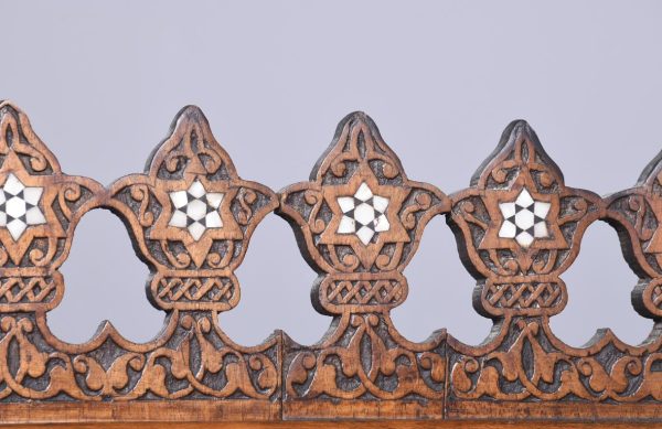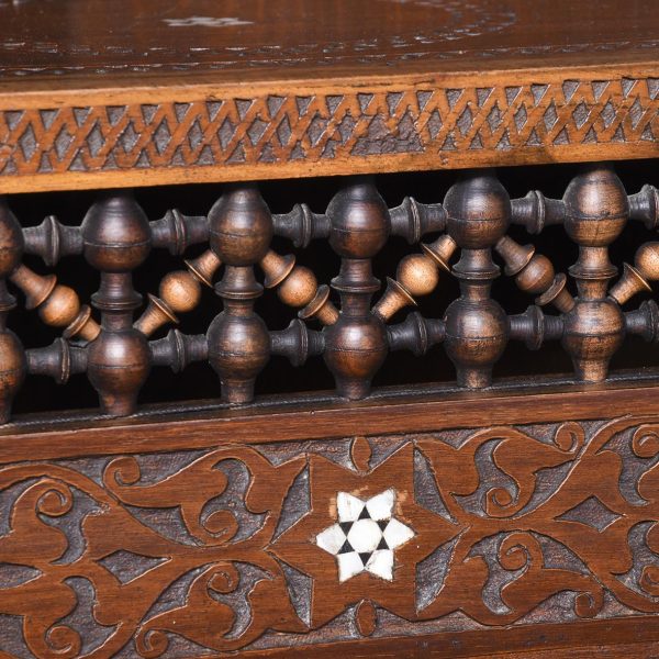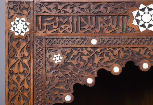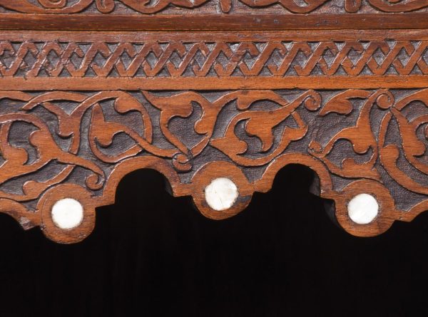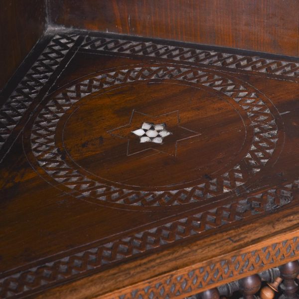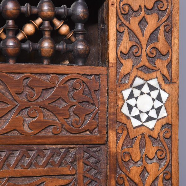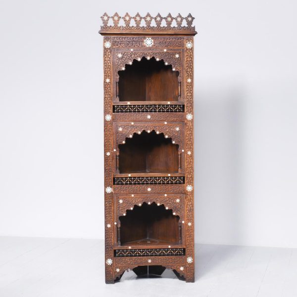 Circa 1900. A stylish and interesting Mashrabiya Moroccan corner cabinet. The top with a classic Arabic pattern inlaid with mother of pearl stars, the pierced top with a wave and carved section beneath, with three shelves each with blind fretwork patterns in the form of a diamond, and circular mother of pearl in the center, the tops arched with mother pearl and classic Arabic motifs, there is an inscription in the top section, which is dissected by a large mother of pearl and ebonized star, finishing on simple carved feet with pierced and inlaid quarter blocks.