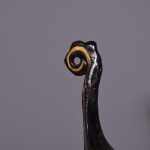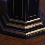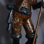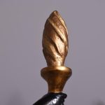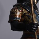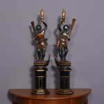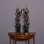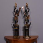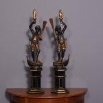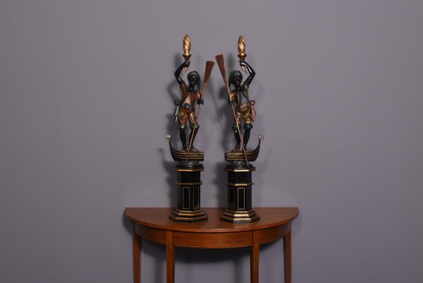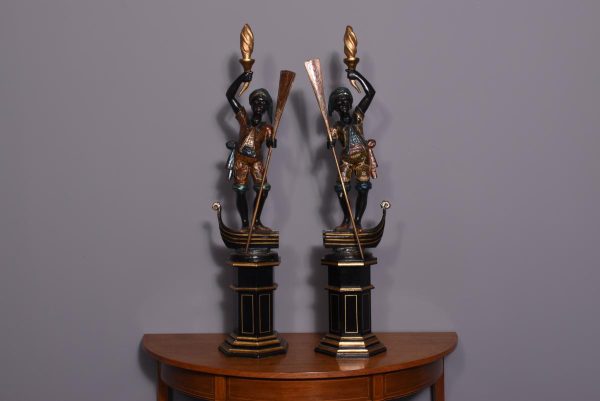 Circa 1870. A stylish pair of Venetian ebonised and polychrome figures of Blackamoor Gondoliers, each with stylish decorated outfits, including shoes, breeches and tops, holding a torch aloft in one hand and a stylish decorated oar in the other, resting on the prow of a gondola, both raised on hexagonal gilded and ebonised bases with stepped enclosed plinths.