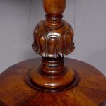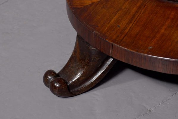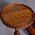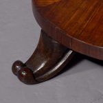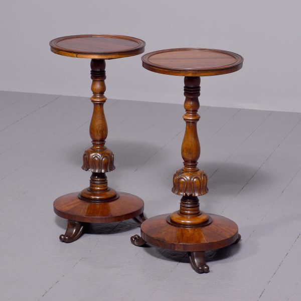 Circa 1840. Pair of William IV rosewood wine or occasional tables. The circular tops with turned moulded rims and supported on vasiform-shaped, ring-turned stems over foliate carved curved cup and turned collars over round, slanted crossbanded bases on three neat cabriole feet.