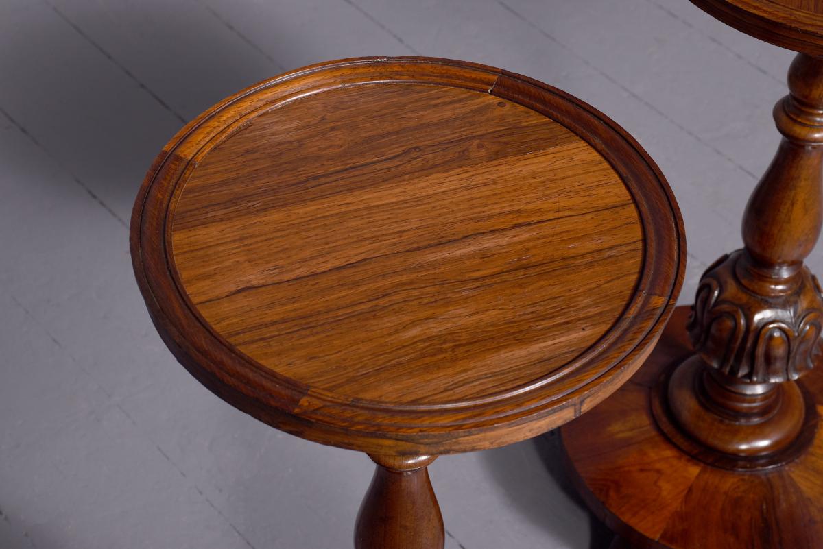 Circa 1840. Pair of William IV rosewood wine or occasional tables. The circular tops with turned moulded rims and supported on vasiform-shaped, ring-turned stems over foliate carved curved cup and turned collars over round, slanted crossbanded bases on three neat cabriole feet.