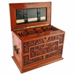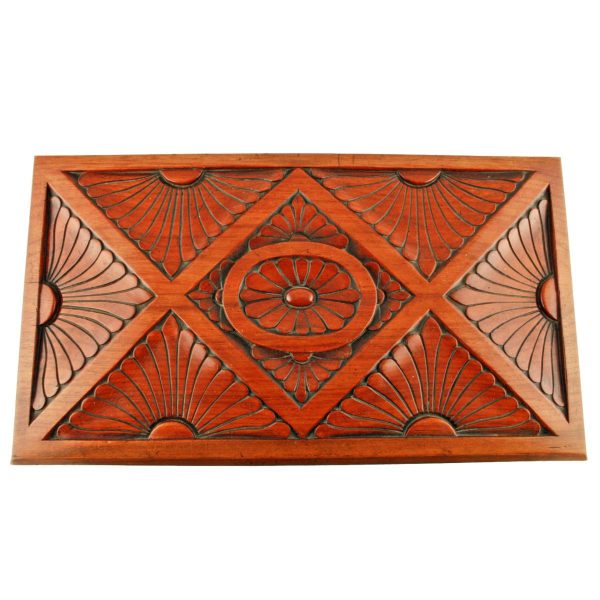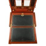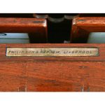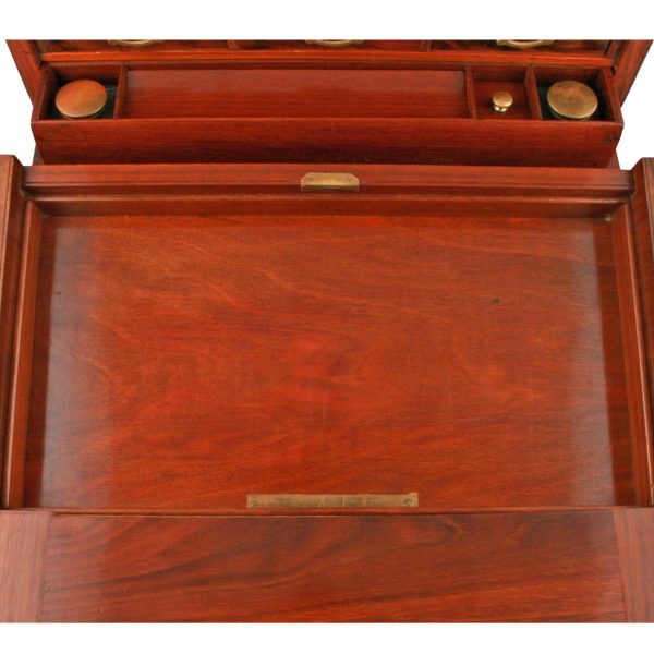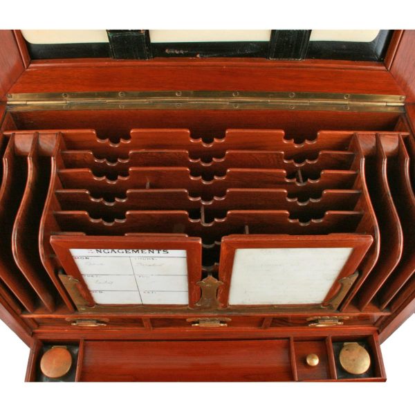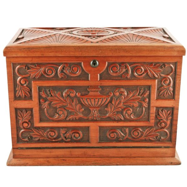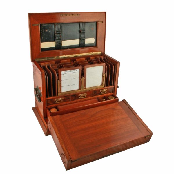 Circa 1880. A late 19th century Victorian carved walnut stationery box, with an engraved brass plate ‘Philip Son & Nephew Liverpool’, and the lock is stamped ‘Bramah London’. The top hinges are vertical and the front falls forward and then hinges open again to a leather-covered writing surface. The top writing surface has a brass catch and handle and lifts to reveal a storage area, the action of the front falling forward allows the ink well and pen storage area to spring forward. Above the inkwells are three drawers with brass handles and their original leather lining. The main body of the box is compartmentalised to hold stationery, envelopes, pamphlets. In the centre are two walnut-edged ceramic note boards held in brass brackets. To the underside of the lid is a leather pen and ruler holder, the exterior is carved and has two heavy-quality brass carrying handles.