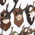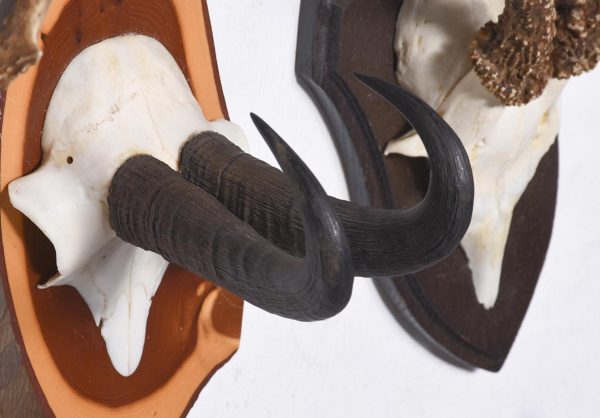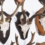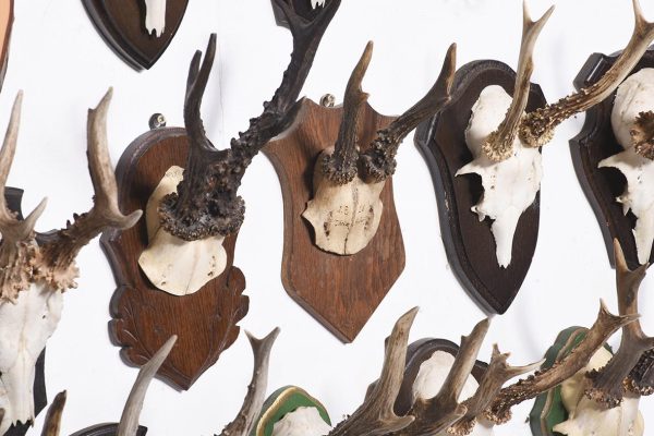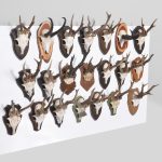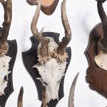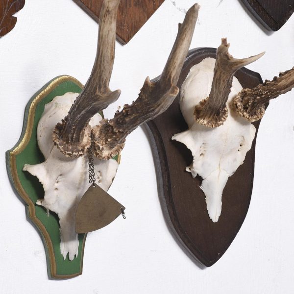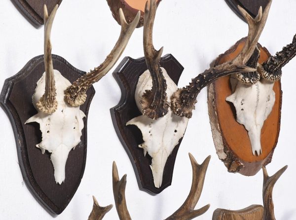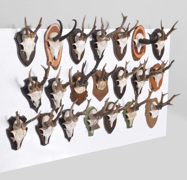 Dating from between the 1900 to the 1950s. 21 various deer horns including ibex and roe deer, all mounted on various heraldic shaped shields, in oak and yew. Will sell separately.