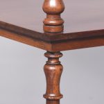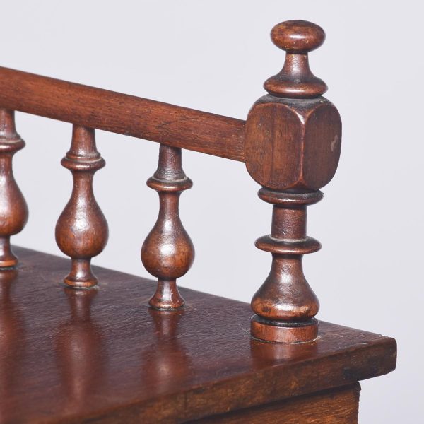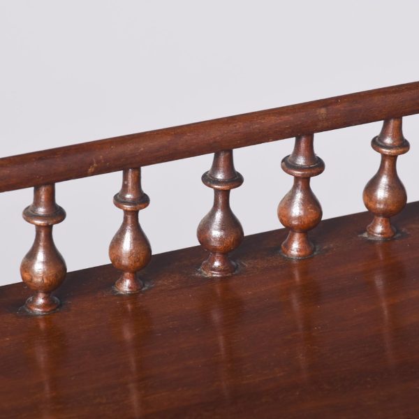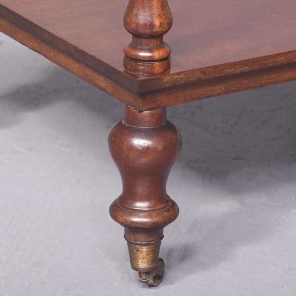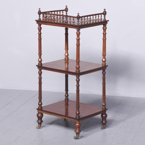 Circa 1860. A quality mahogany 3 tier whatnot. The top with ¾ gallery comprising of stylish balustrades with a half round cap, with finials on each of the corners. Two tiers beneath all supported on turned ring turned columns, all resting on four elegant bulbous tulip shaped feet finishing with a brass cup and castor. Under the top tier there is a trade label ‘Miller & Sons furniture brokers, Thame’.