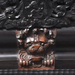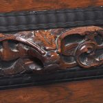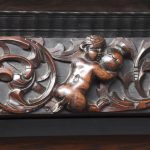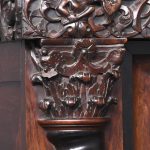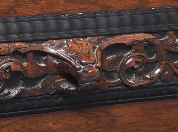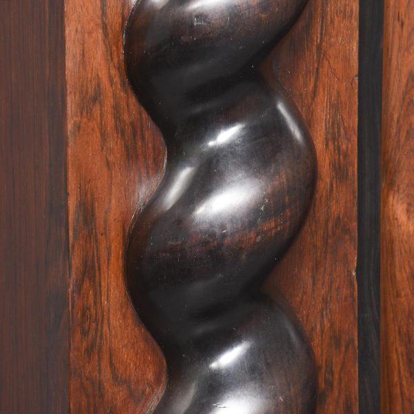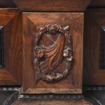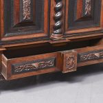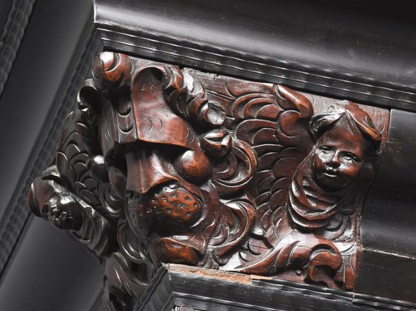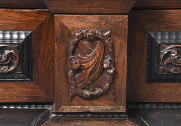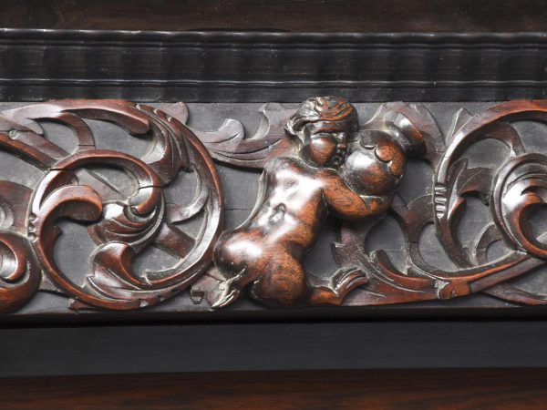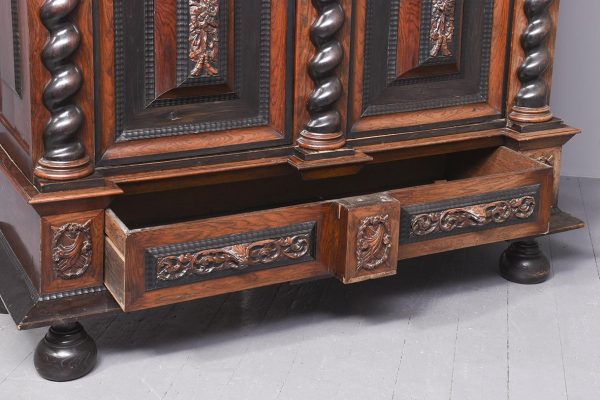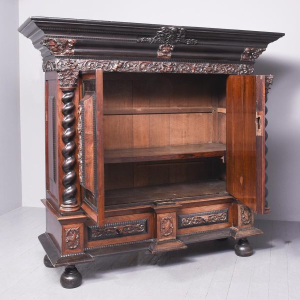Circa 1680. A late 17th Century Flemish/Dutch rosewood ebony and ebonized kast. The projecting cornice carved with a lion’s mask with a rampant lion cartouche above a frieze carved with foliate scrolls and putti. The panel moulded doors with ripple carving and trailing flower garlands, flanked and divided by spiral carved columns, the central column is movable, concealing the escutcheon, opening to a shelved interior on a breakfront base with one long drawer, carved with further foliate scrolls, raised on four large squat bun feet.