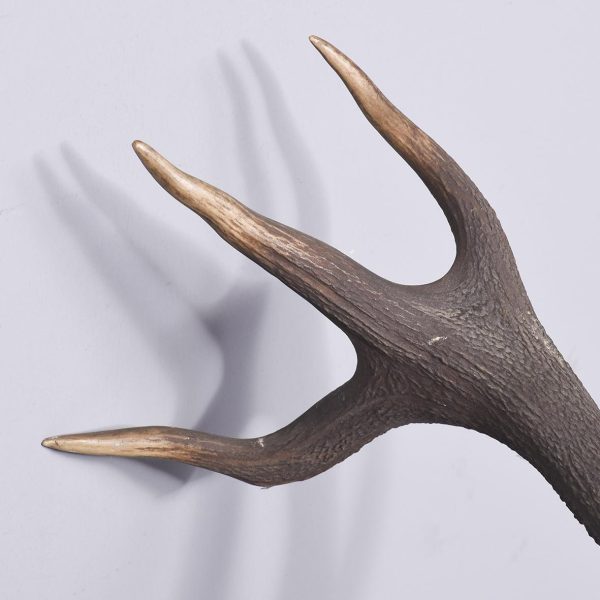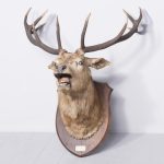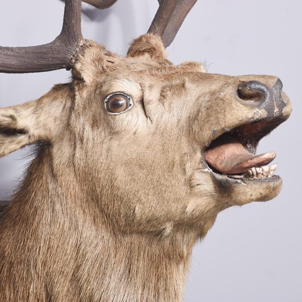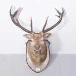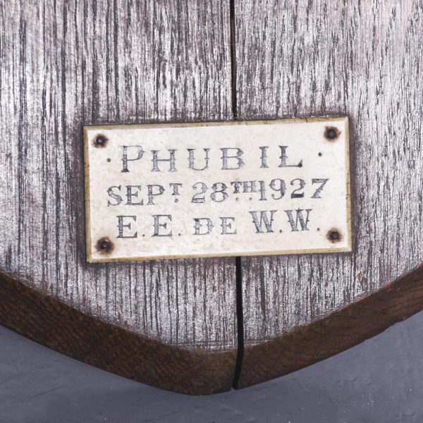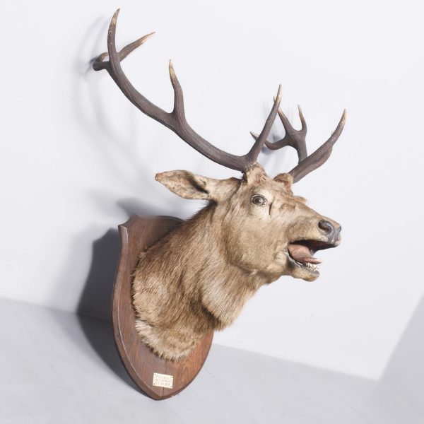 Dated 28th September 1927. A 10-point stags head taxidermy. Shoulder mount on a heraldic shaped polished oak shield, the plaque inscribed ‘Phubil September 28th 1927, EE de WW’. The stag with the mouth open showing tongue and teeth with realistic glass eyes.