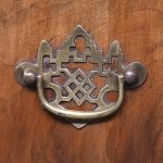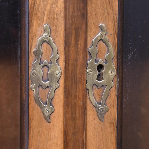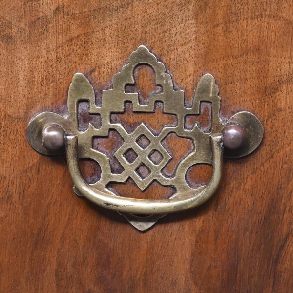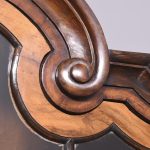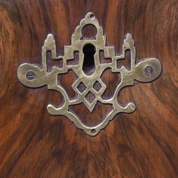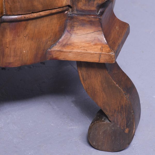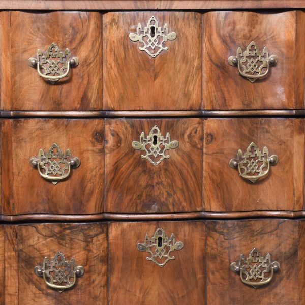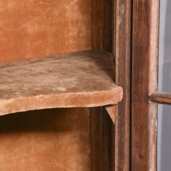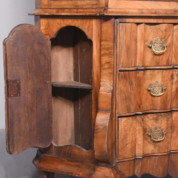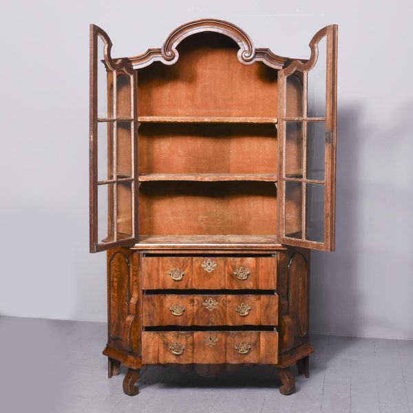 Circa 1830. A Dutch walnut display cabinet. The arched and moulded cornice above a pair of glazed mullioned doors and side lights enclosing green plush lined shelves. The lower part with three shaped fronted drawers flanked by angled arched cupboards to the sides, raised and scrolling feet to the front.