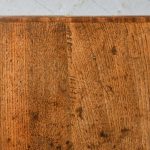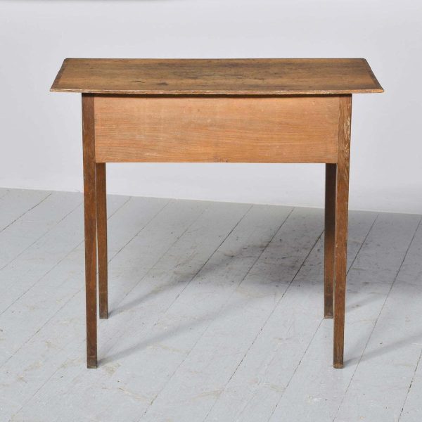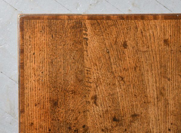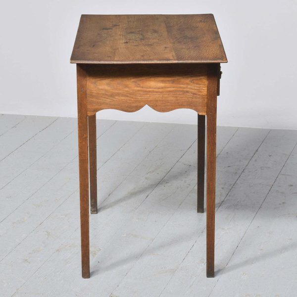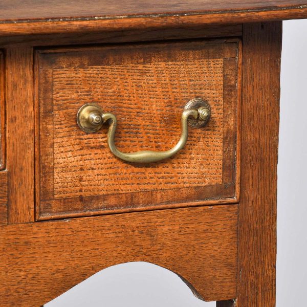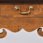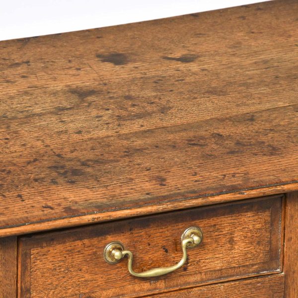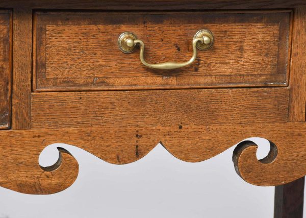 Circa 1770 a good George III oak lowboy. The rectangular top with mahogany cross banding and a simple moulded edge, one narrow drawer flanked by two larger drawers each with mahogany cross banding and cast brass swan neck handles, beneath it there is an elegant shaped carved apron, all standing on four simple square tapering legs. The lowboy has excellent colour and patination.