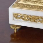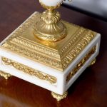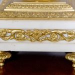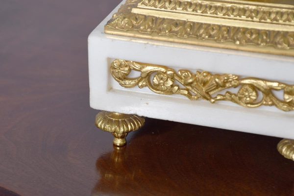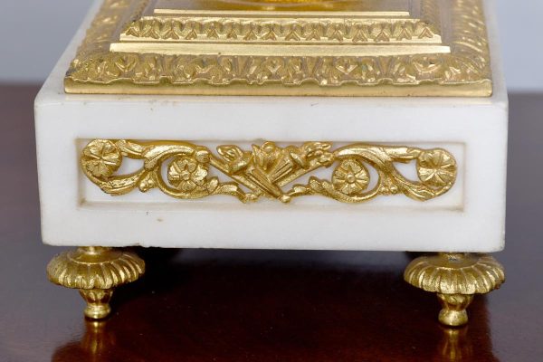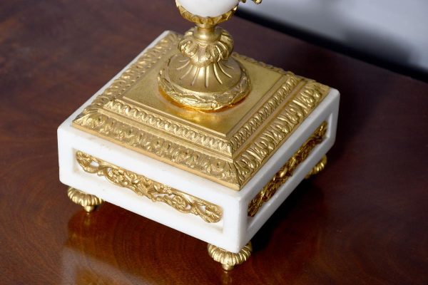 Circa 1870. A gilded and white marble candelabrum, the top surmounted by a single candle holder with stylish sides, drip tray and a foliate cast gilded brass stem which issues four more candleholders with scrolling arms to the top and foliate casting to the bottom, all similar to the top, resting on a white marble base with ormolu rams heads, swags and tails, finishing on a gilded platform base which sits on square marble with pierced gilding inserts on each of the facings, all resting on four gilded toupie feet.
