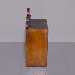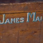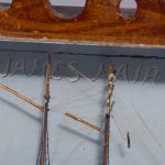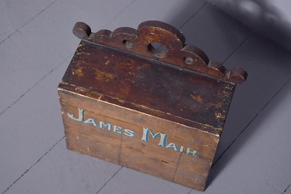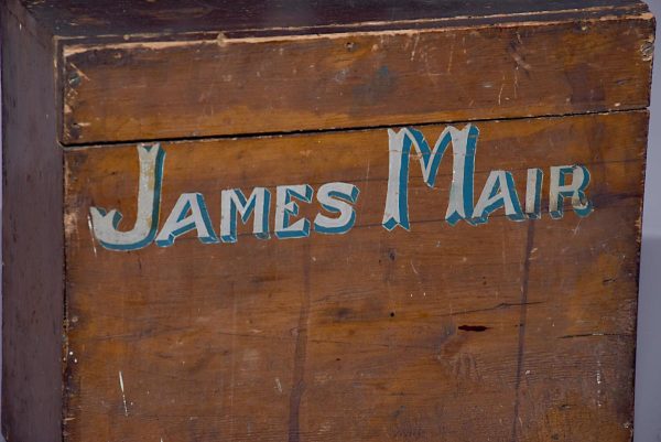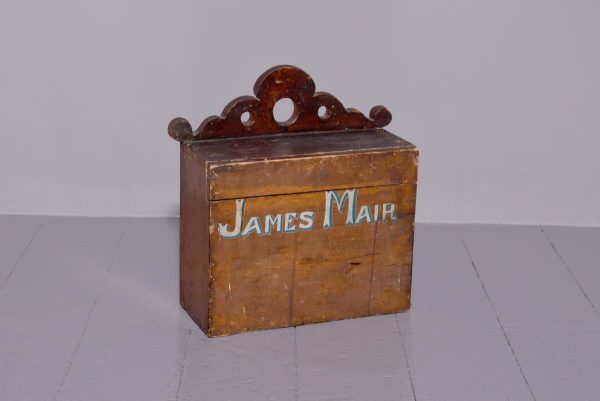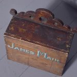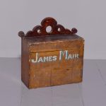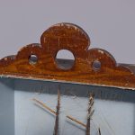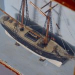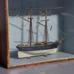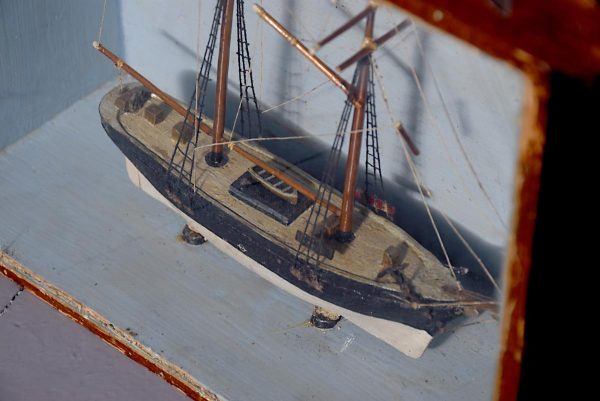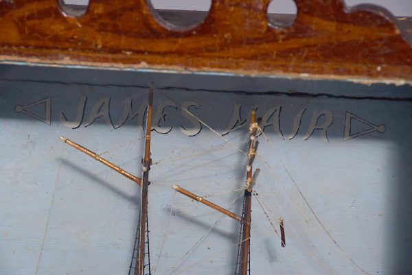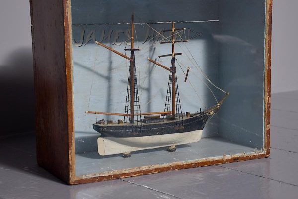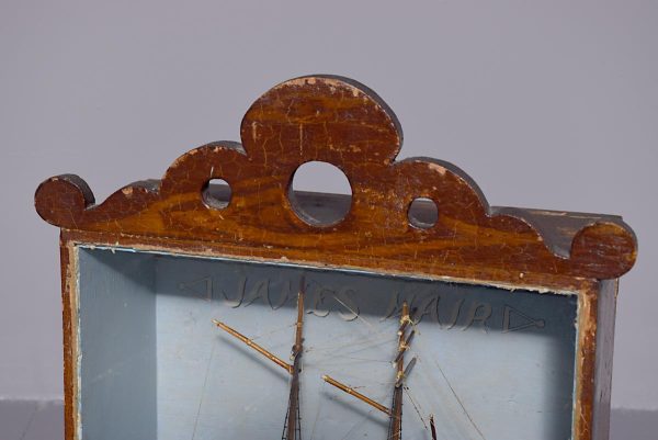 Circa 1870. A stylish primitive glazed model of a sailing ship in a diorama case, the glazed front with a stylish pierced pediment, the paintwork on the case is scumbled, inside the blue painted interior has the name ‘James Mayer’ painted on it, this name is also painted on the back of the case. There is a two-mast ship with all of the rigging, but no sails.