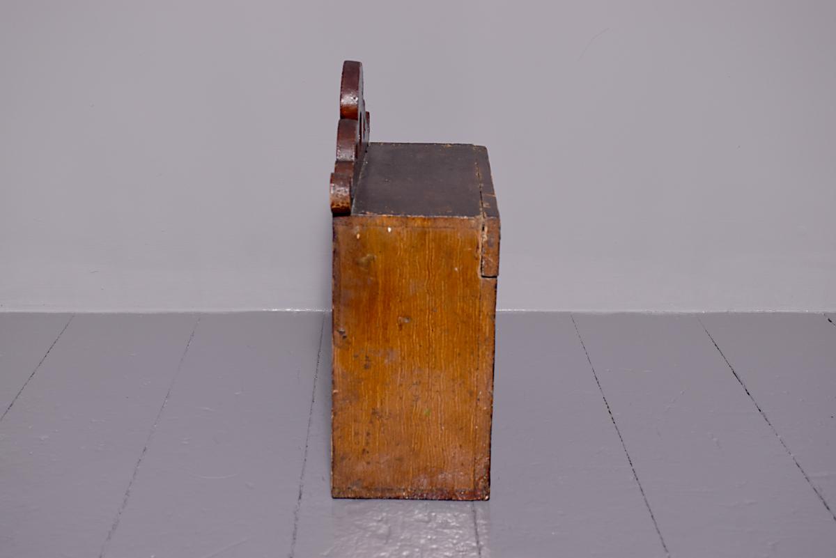 Circa 1870. A stylish primitive glazed model of a sailing ship in a diorama case, the glazed front with a stylish pierced pediment, the paintwork on the case is scumbled, inside the blue painted interior has the name ‘James Mayer’ painted on it, this name is also painted on the back of the case. There is a two-mast ship with all of the rigging, but no sails.