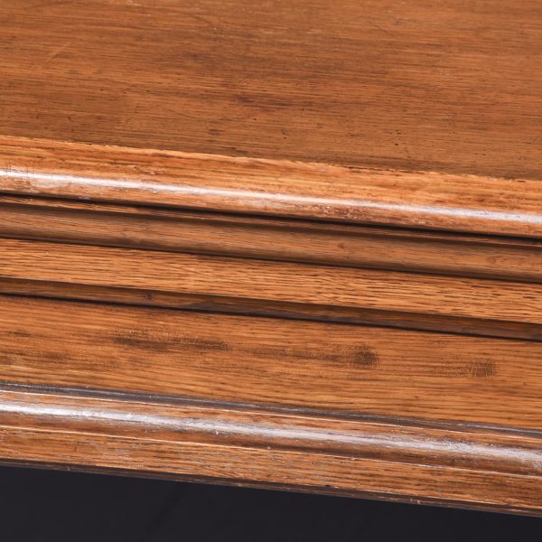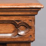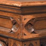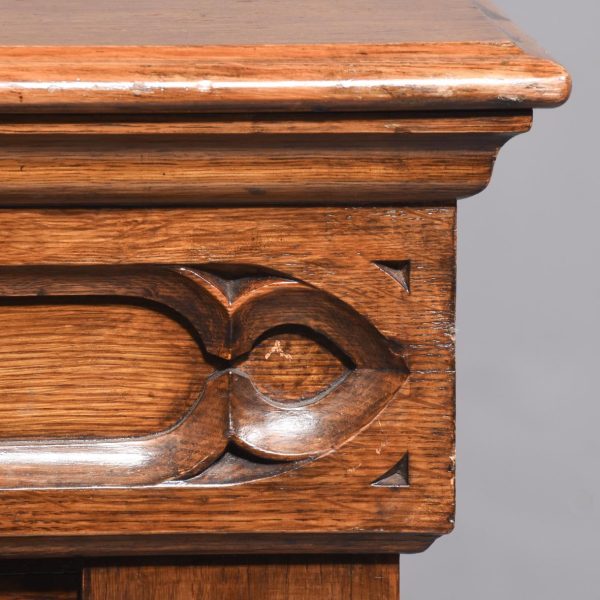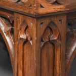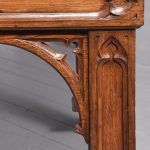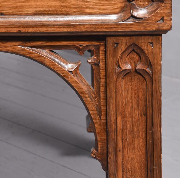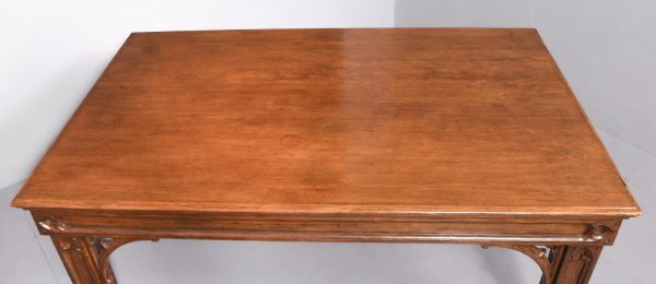 Circa 1860. An early Victorian solid oak dining table in a gothic taste, the rectangular top with molded fore-edge, frieze with gothic tracing to the ends with pierced elegant quarter brackets resting on four square legs each with gothic arches in the facings. Finishing on the shaped foot with the original castors beneath.