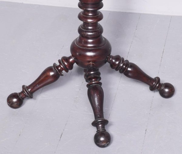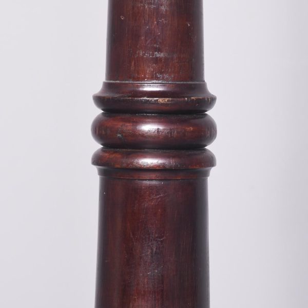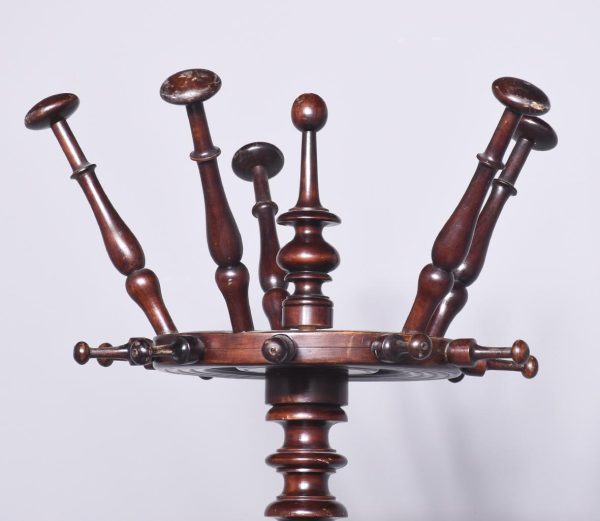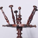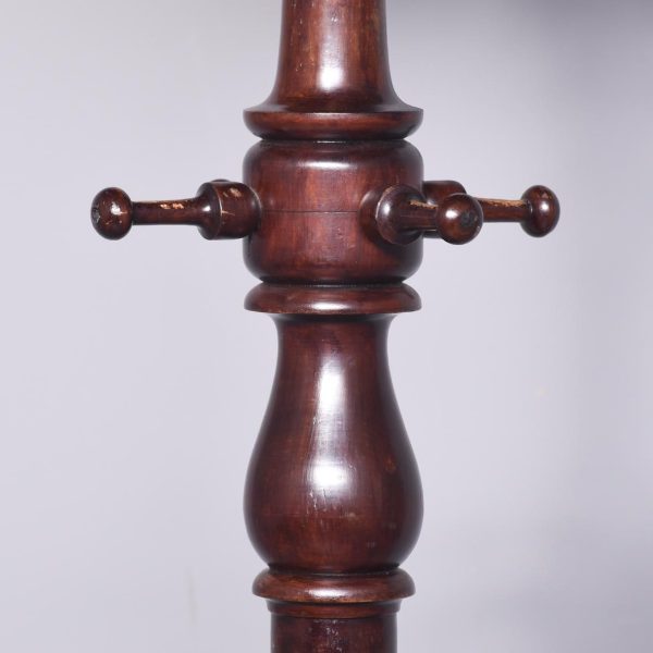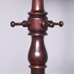 Circa 1880. An unusual and stylish stained beech Turner’s hall stand. The circular top with four turned uprights, centered by an elegant finial, with small turned pegs to the outside. All contained on a circular ribbed disc attached to a turned stem, with further pegs beneath, finishing with a bulbous section in the base, all resting on four turned splayed feet with a downward facing finial beneath.