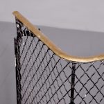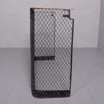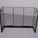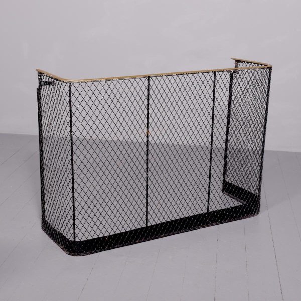 A large Victorian brass and metal nursery fender, the top in brass rail folded over the edges, the body in iron mesh supported by five uprights with two metal clasps for fixing to wall, resting on a simple base with a small spark guard.