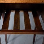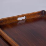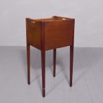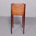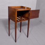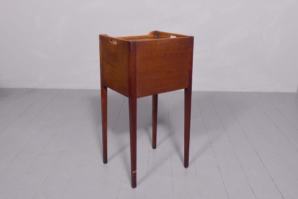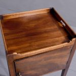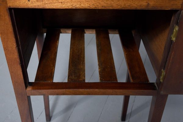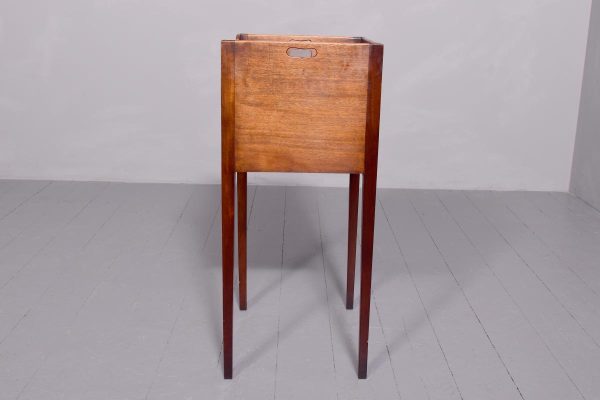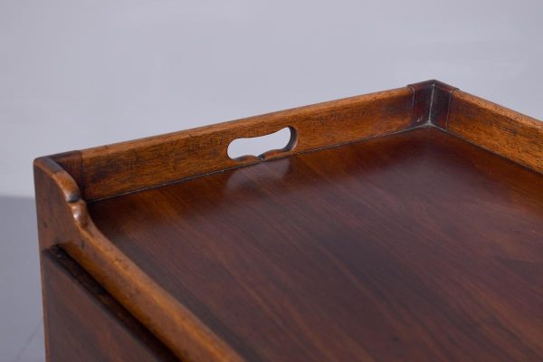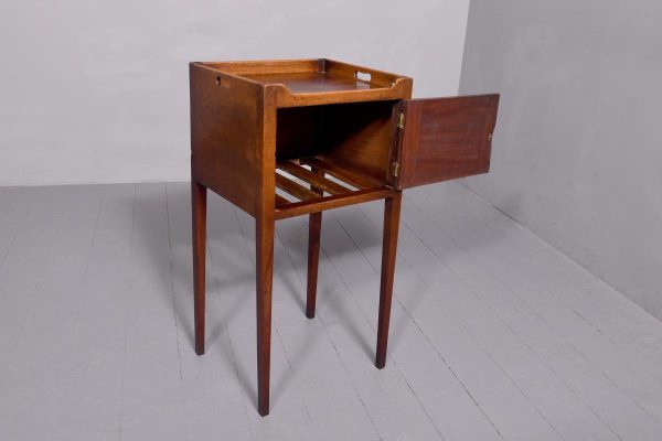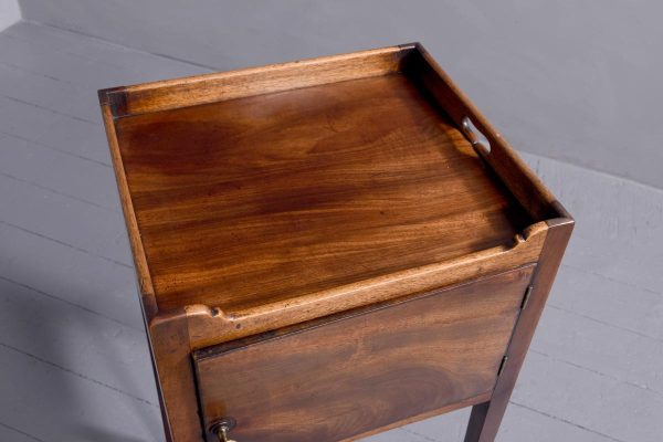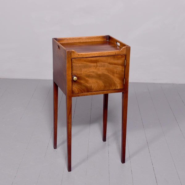 Circa 1800. A Late George III mahogany bedside cabinet, the top in fine flame mahogany with a three quarter gallery which dips at the front, with a pair of stylish pierced lifting handles to the sides, the full size door with a simple string inlay to the fore-edge, and brass knob handle, opens to reveal a uninterrupted slatted based interior, resting on four square tapering legs, the cabinet polished on all sides making it free-standing.