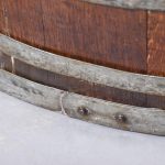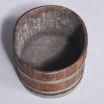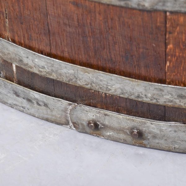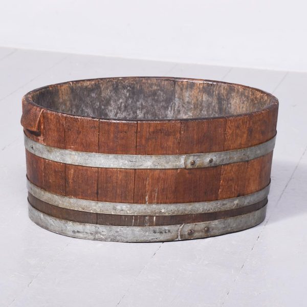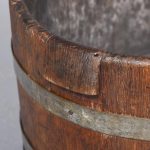 Circa 1900.  A neat sized low oak staved barrel, with held in place by three polished steel bandings, the ends and the top are a slightly thicker to form a grip, the bottom is in staved in oak.
