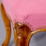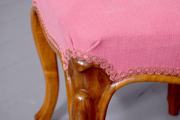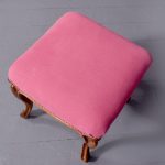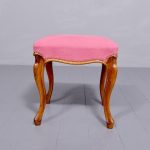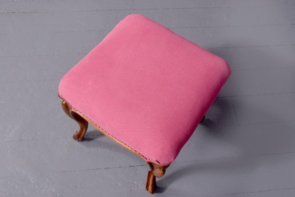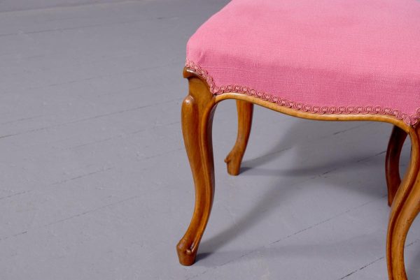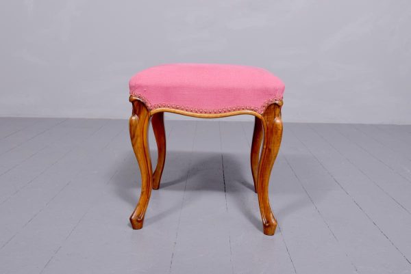 Circa 1850 A Mid-Victorian walnut framed cabriole legged stool, the top recently reupholstered in pink fabric with coordinating gimp, with a beaded and shaped frame, all resting on four elegant well shaped cabriole legs, with a raised top and section and finishing on a well-formed foot