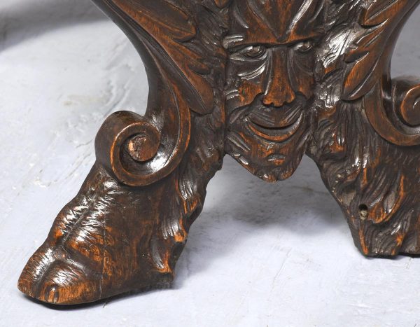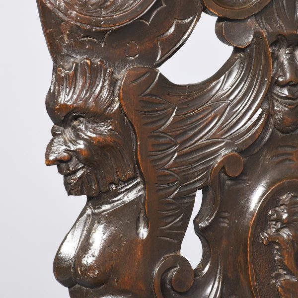 Circa 1900. A carved Sgabello Hall chair.  The neat sized chair with carved pierced and shaped back, solid scooped seat with further decoration. Classic sgabello front leg with mythical figures, foliate carving pierced section. Finishing on an animal foot and simple shaped back foot.