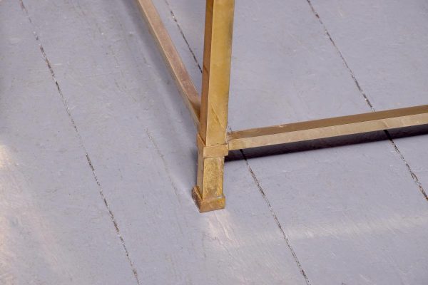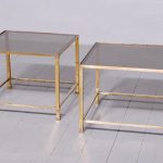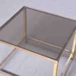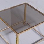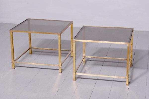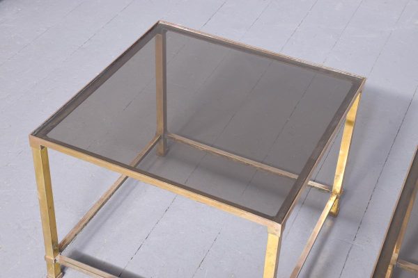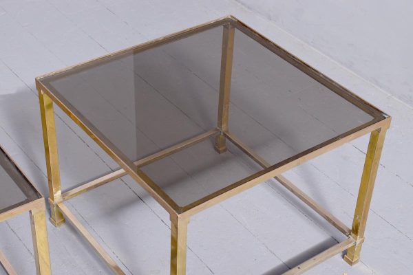 Circa 1950. Pair of stylish, French, solid brass and smoked plate glass square coffee tables. The plate glass tops supported in brass upper frames on square supports with square stretchers over small block feet. Fine quality, stylish and decorative.