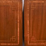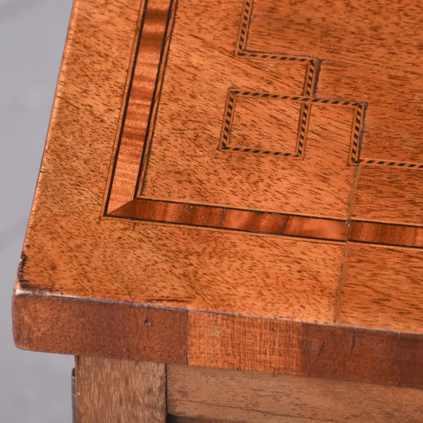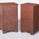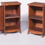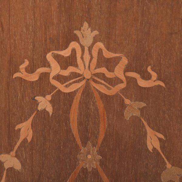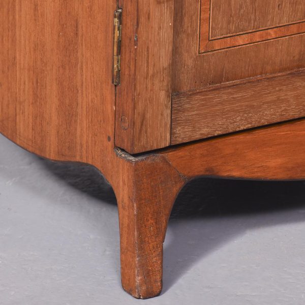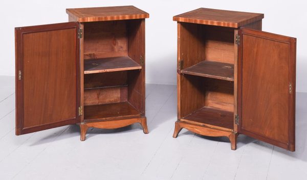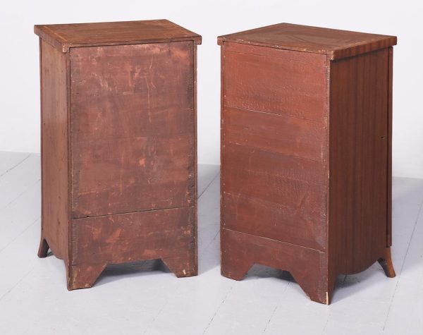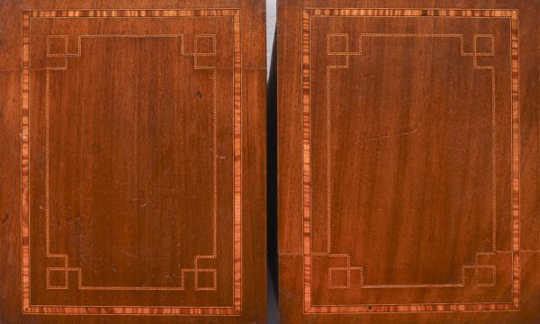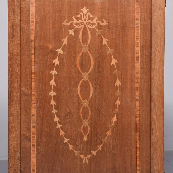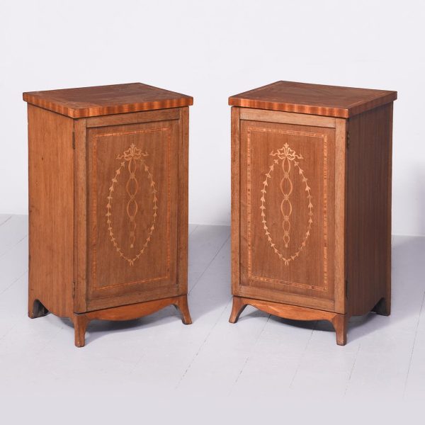 Circa 1890. A pair of late 19th Century inlaid Sheraton-style mahogany lockers. The tops with satinwood, boxwood and ebony inlay over the doors with neoclassical ribbons and bellflower chains surrounded by satinwood inlay and all supported on splayed French feet. With restorations.