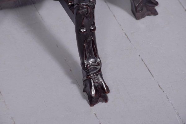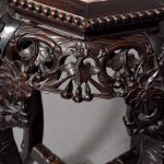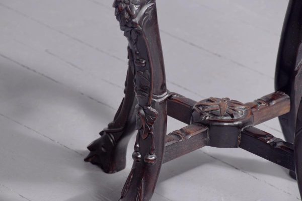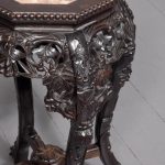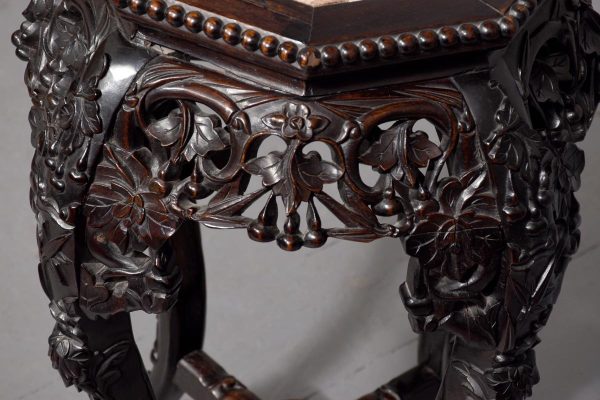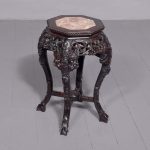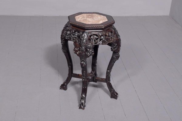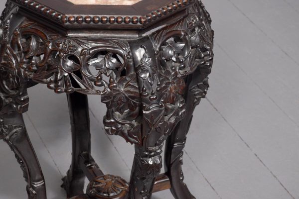 Circa 1890. A Qing dynasty Hongmu Chinese marble top insert plant stand, the octagonal shaped stand with pink variegated marble insert, fore-edges with fine beading and a pierced frieze with classical Chinese motifs, including foliate carving, flowers and flower heads, supported on profusely carved cabriole legs which are braced by cruciform stretchers with a rondel with a carved bamboo on the facing, finishing on classic Chinese feet, all great colour and patination, clean and sturdy.
