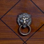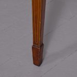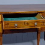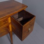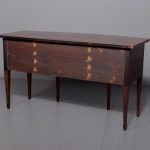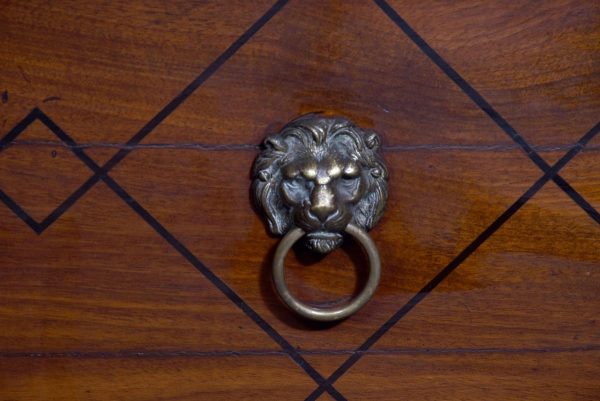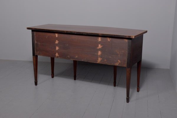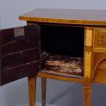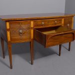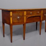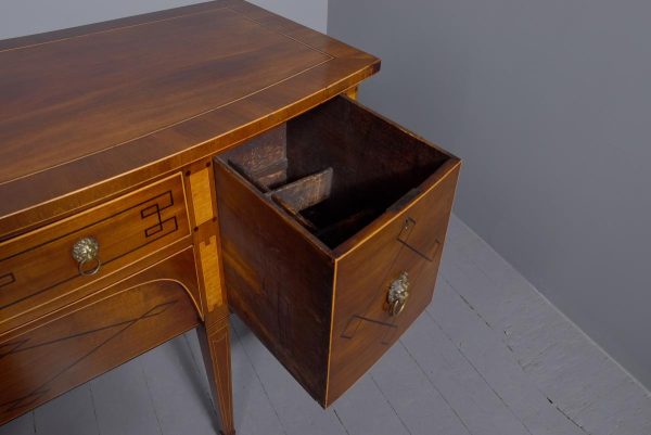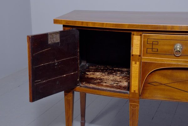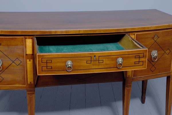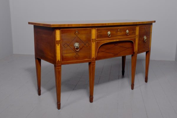 Circa 1790. A large stylish bow fronted mahogany and inlaid George III sideboard, the top with fine figured mahogany with triple string inlay, broad banding and a boxwood banded fore edge, the front with a configuration of one curved drawer with stylish geometric inlay with a pair of brass lion mask handles with ring pulls through the mouth, beneath this there is a drawer in the frieze with inlaid quarter sections and geometric inlay, flanked by a full length drawer on the right fitted for wine bottles, with large cast brass lion mask handles, the other side has a faux drawer which opens to reveal a cupboard with uninterrupted space with similar handle and inlay, all resting on six stout legs with the ones at the front with satinwood and various inlaid panels and inlay, the tops of the legs with inverted arches and finishing on extended toes, all with great colour and patination, in excellent condition.