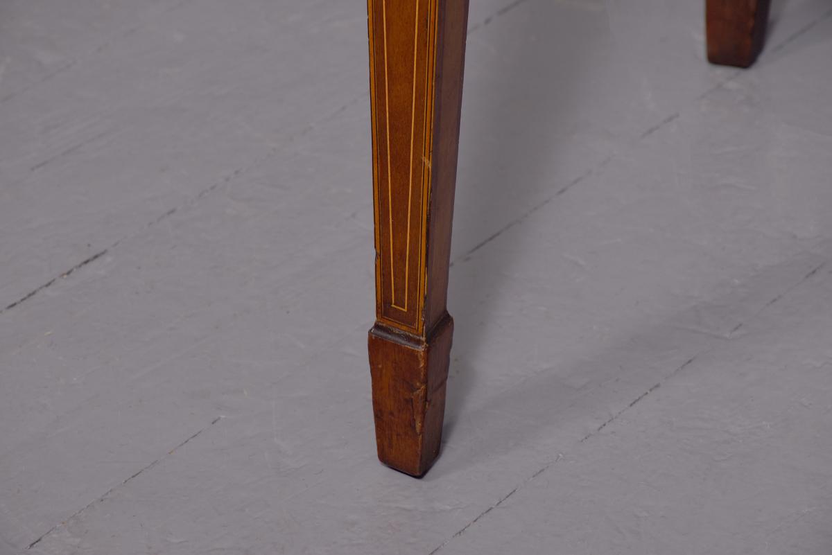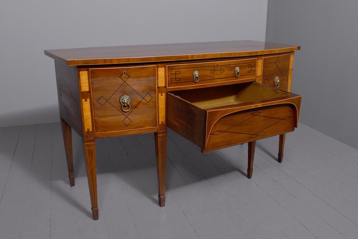 Circa 1790. A large stylish bow fronted mahogany and inlaid George III sideboard, the top with fine figured mahogany with triple string inlay, broad banding and a boxwood banded fore edge, the front with a configuration of one curved drawer with stylish geometric inlay with a pair of brass lion mask handles with ring pulls through the mouth, beneath this there is a drawer in the frieze with inlaid quarter sections and geometric inlay, flanked by a full length drawer on the right fitted for wine bottles, with large cast brass lion mask handles, the other side has a faux drawer which opens to reveal a cupboard with uninterrupted space with similar handle and inlay, all resting on six stout legs with the ones at the front with satinwood and various inlaid panels and inlay, the tops of the legs with inverted arches and finishing on extended toes, all with great colour and patination, in excellent condition.