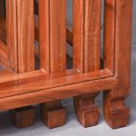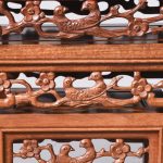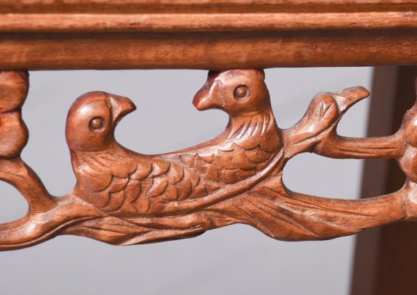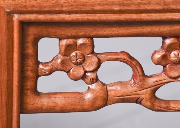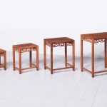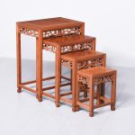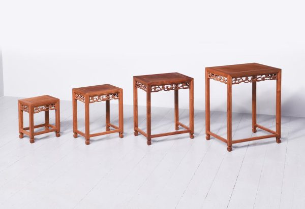 Circa 1950s. A quartetto or nest of 4 Chinese hardwood tables. Rectangular tables with a floating panel insert, and broad banding, each of the tables has a pierced frieze with classic Chinese motifs. All resting on four square legs with a beading on the inside with conforming stretchers, the smallest table has stretchers on all sides which gives the set a lovely symmetry. The tables are clean and sturdy.