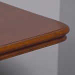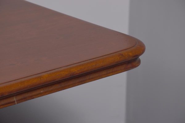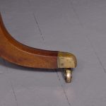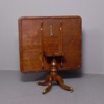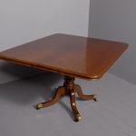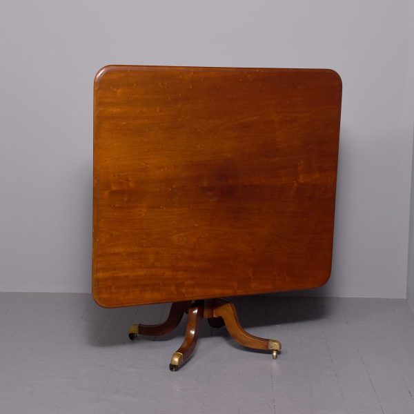 Circa 1815. A Regency mahogany rectangular snap top breakfast table, the top in the finest flame mahogany with moulded fore-edge and shaped frieze, resting on a mahogany block which includes a brass clasp for locking in position and two brass bolts all resting on a turned stem, issuing four hipped cabriole legs finishing on a brass block with brass castors beneath.