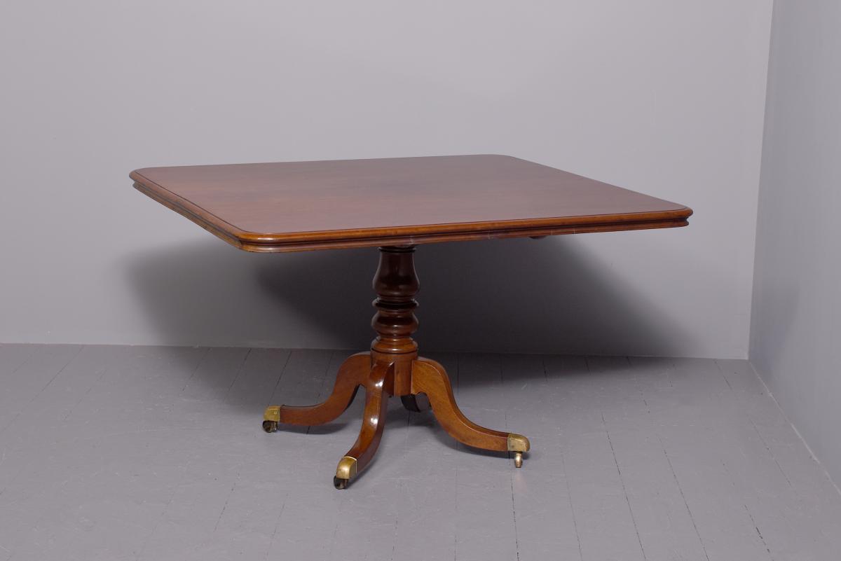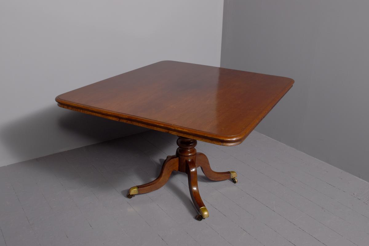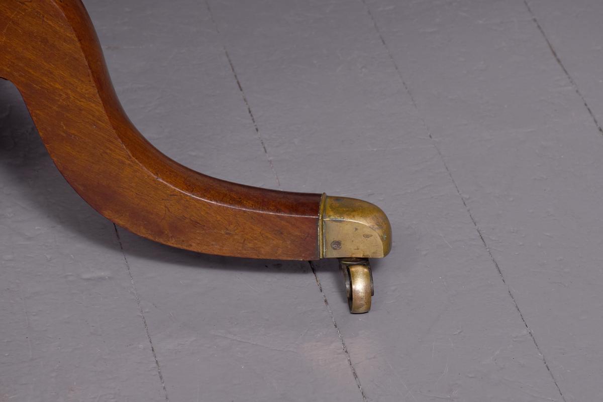 Circa 1815. A Regency mahogany rectangular snap top breakfast table, the top in the finest flame mahogany with moulded fore-edge and shaped frieze, resting on a mahogany block which includes a brass clasp for locking in position and two brass bolts all resting on a turned stem, issuing four hipped cabriole legs finishing on a brass block with brass castors beneath.