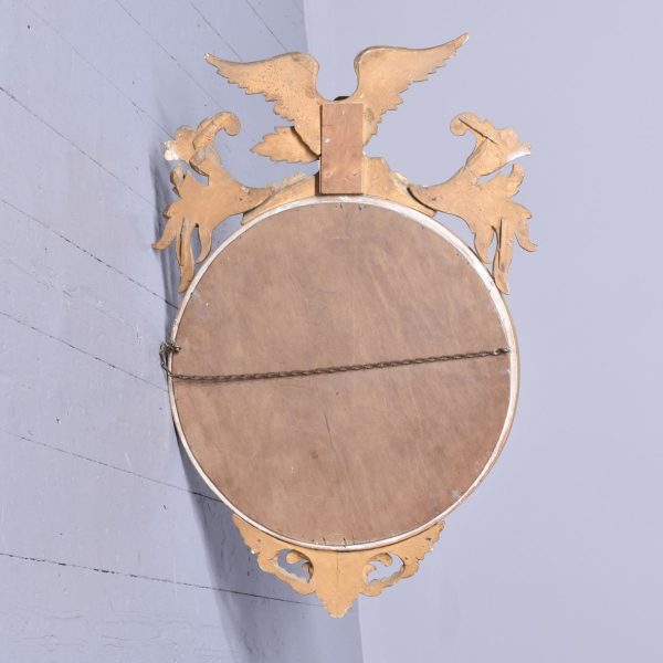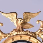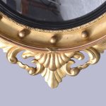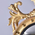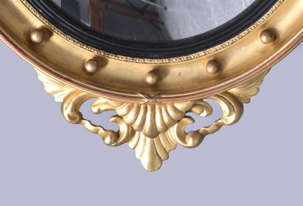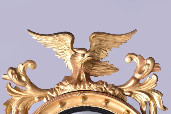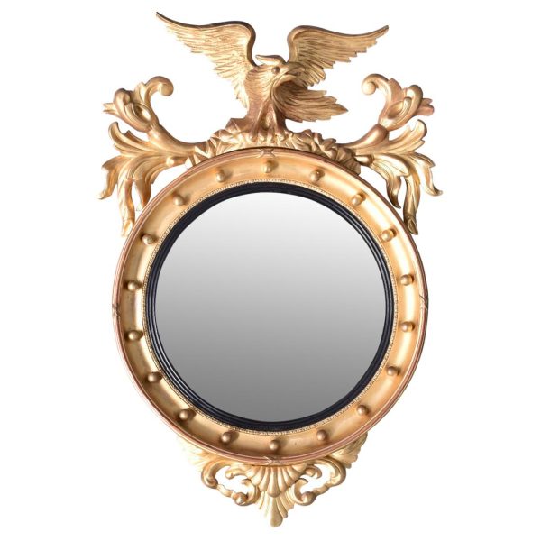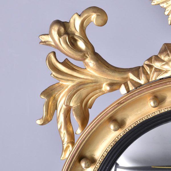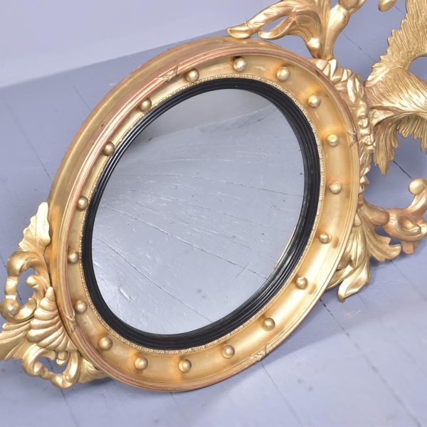 Circa 1880, A good Regency style gilded convex mirror, top surmounted with a Hoho bird standing on a rocky base with foliate carving on both sides. The circular mirror frame with a concave section with gilded balls, ribbed ebonized Bessel, with original convex mirror, base with further foliate carvings, the mirror has excellent colour and style.